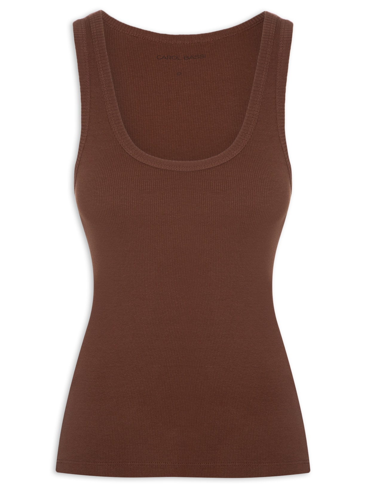 A regata marrom é confeccionada em malha canelada com alta elasticidade. A peça justa ao corpo possui decote U, alças médias e cavas regulares.