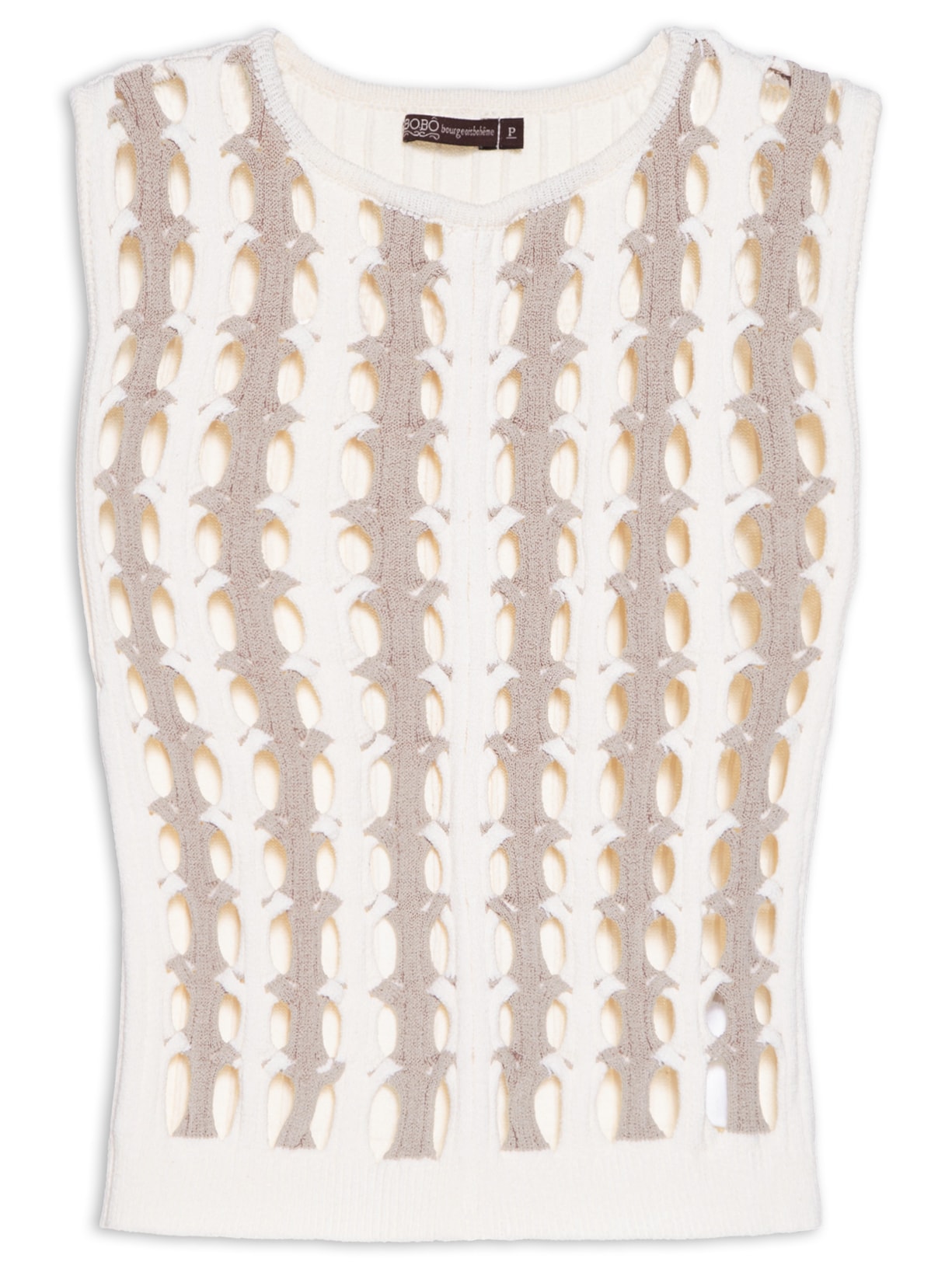 A regata bege é confeccionada em tricot. A peça possui decote redondo, alças largas, cavas regulares, recortes vazados na parte frontal, tag metalizada da marca na parte posterior, comprimento cropped*, shape justo, caimento reto e acabamento canelado.