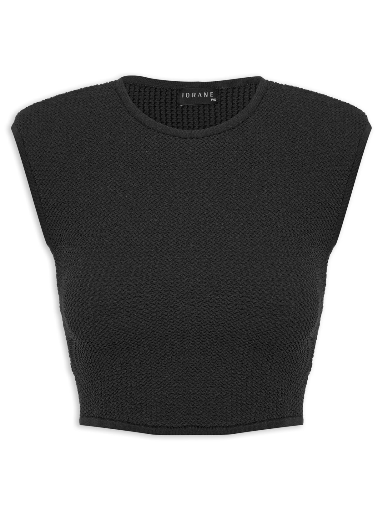A regata preta é confeccionada em tricot com superfície texturizada. A peça possui decote redondo, ombreiras, cavas regulares, comprimento cropped*, shape solto, caimento reto e acabamento canelado.