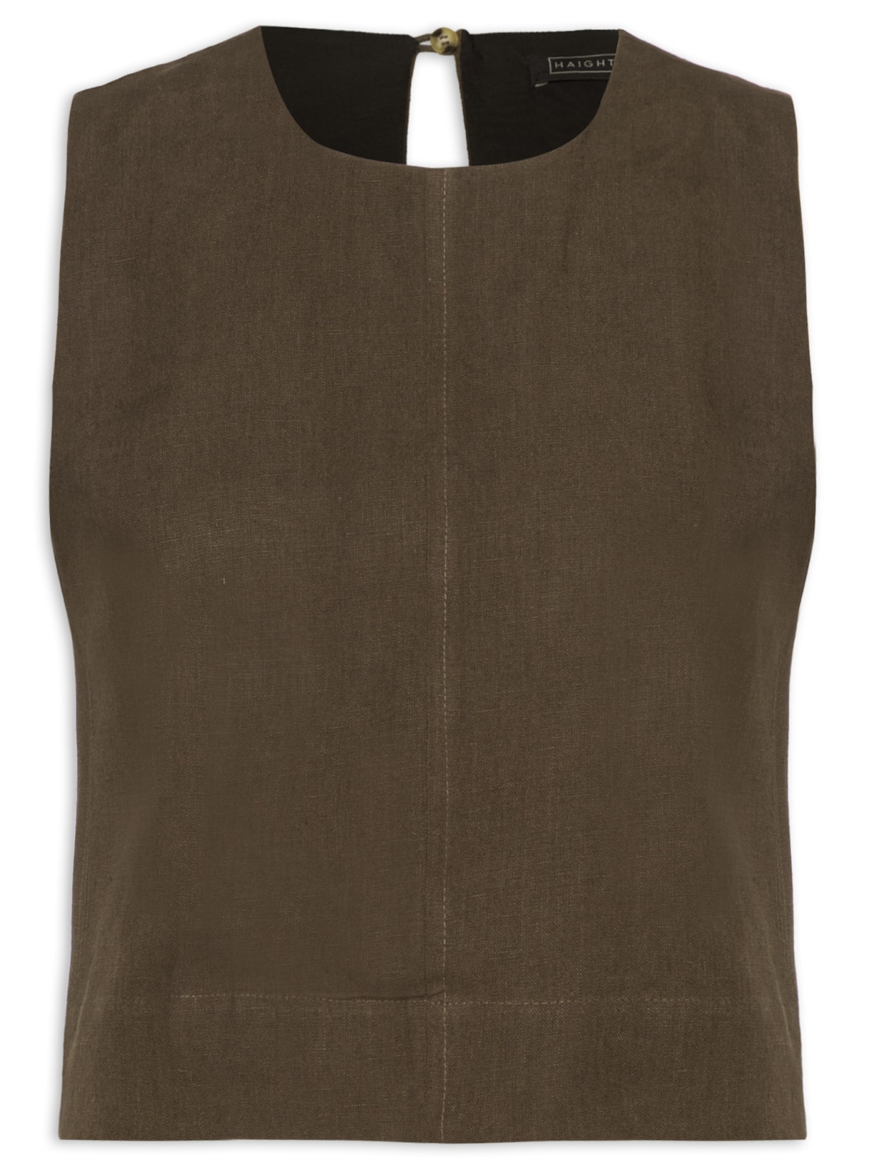 A regata marrom é confeccionada em linho sem elasticidade. A peça solta ao corpo possui decote redondo, alças grossas, cavas levemente estendidas, forro e recorte posterior vazado com fechamento por botão.