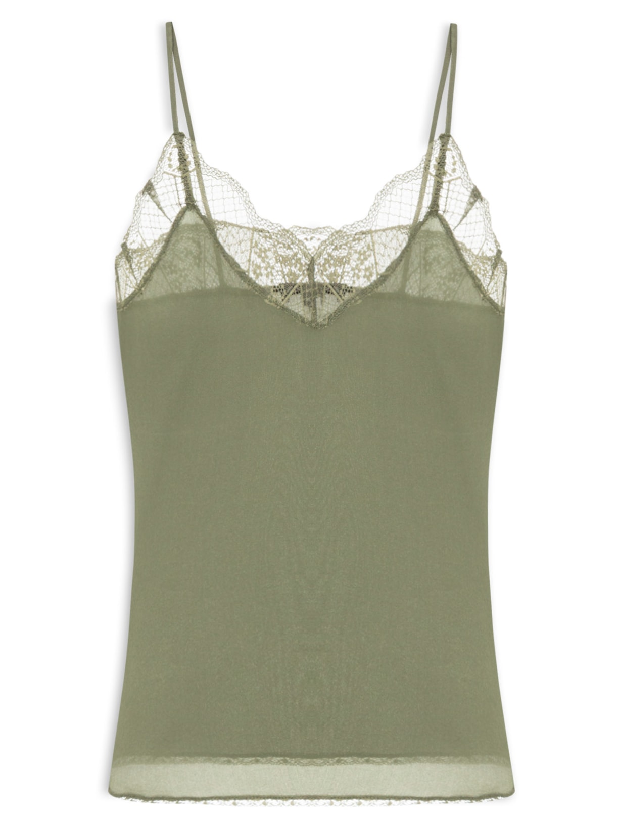 A regata verde é confeccionada em seda sem elasticidade. A peça solta ao corpo possui decote em V, alças finas, barra arredondada, acabamento em renda no decote e nas barras e tag da marca aplicada no decote posterior.