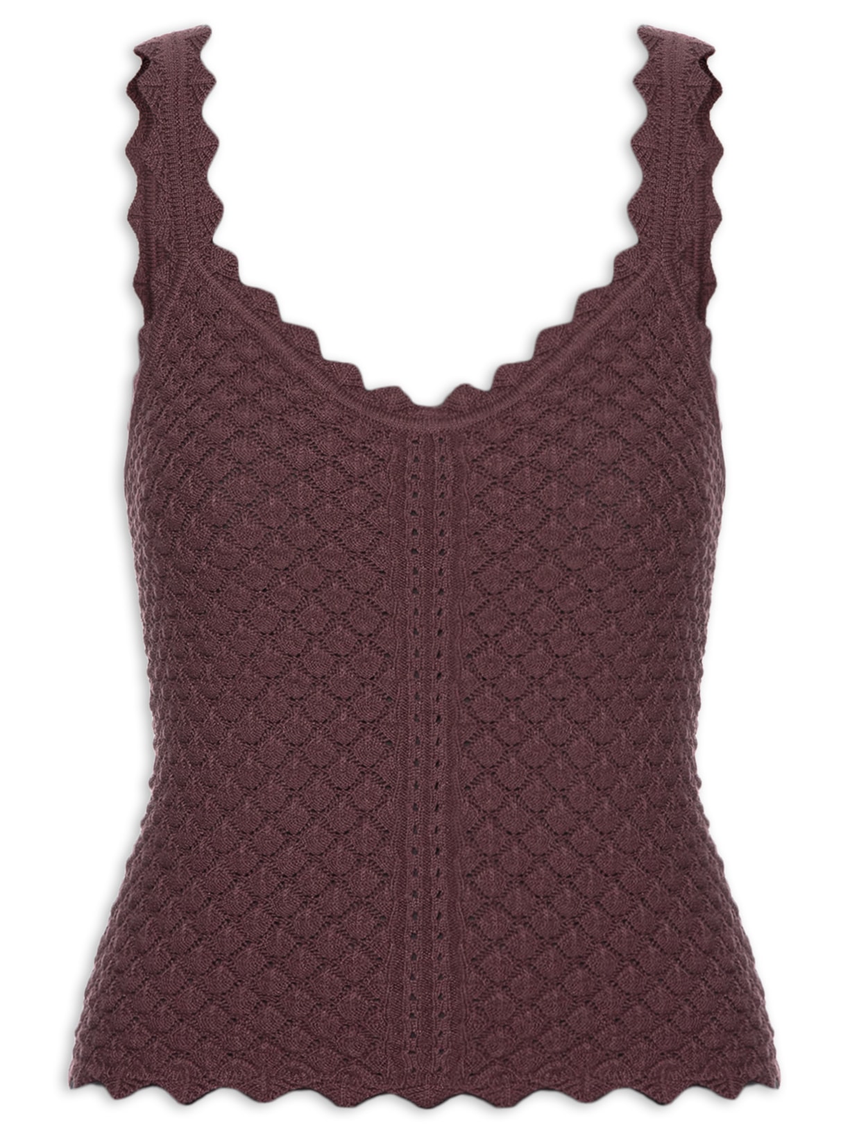 A regata vinho é confeccionada em tricot com superfície texturizada e alta elasticidade. A peça justa ao corpo possui decote V, alças finas, recortes geométricos no decote e nas alças, cavas regulares, decote posterior em U, detalhes geométricos na trama e tag da marca metalizada aplicada na parte posterior.