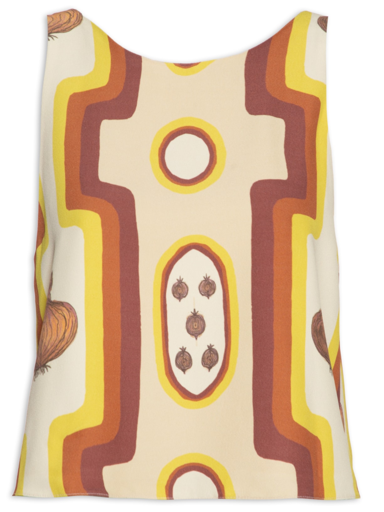 A regata laranja é confeccionada em tecido leve com superfície texturizada sem elasticidade. A peça solta ao corpo possui decote redondo, alças finas, cavas estendidas, decote posterior em V, forro, estampa geométrica e figurativa de cebolas em cores contrastantes e abertura posterior com fechamento por tiras estendidas.