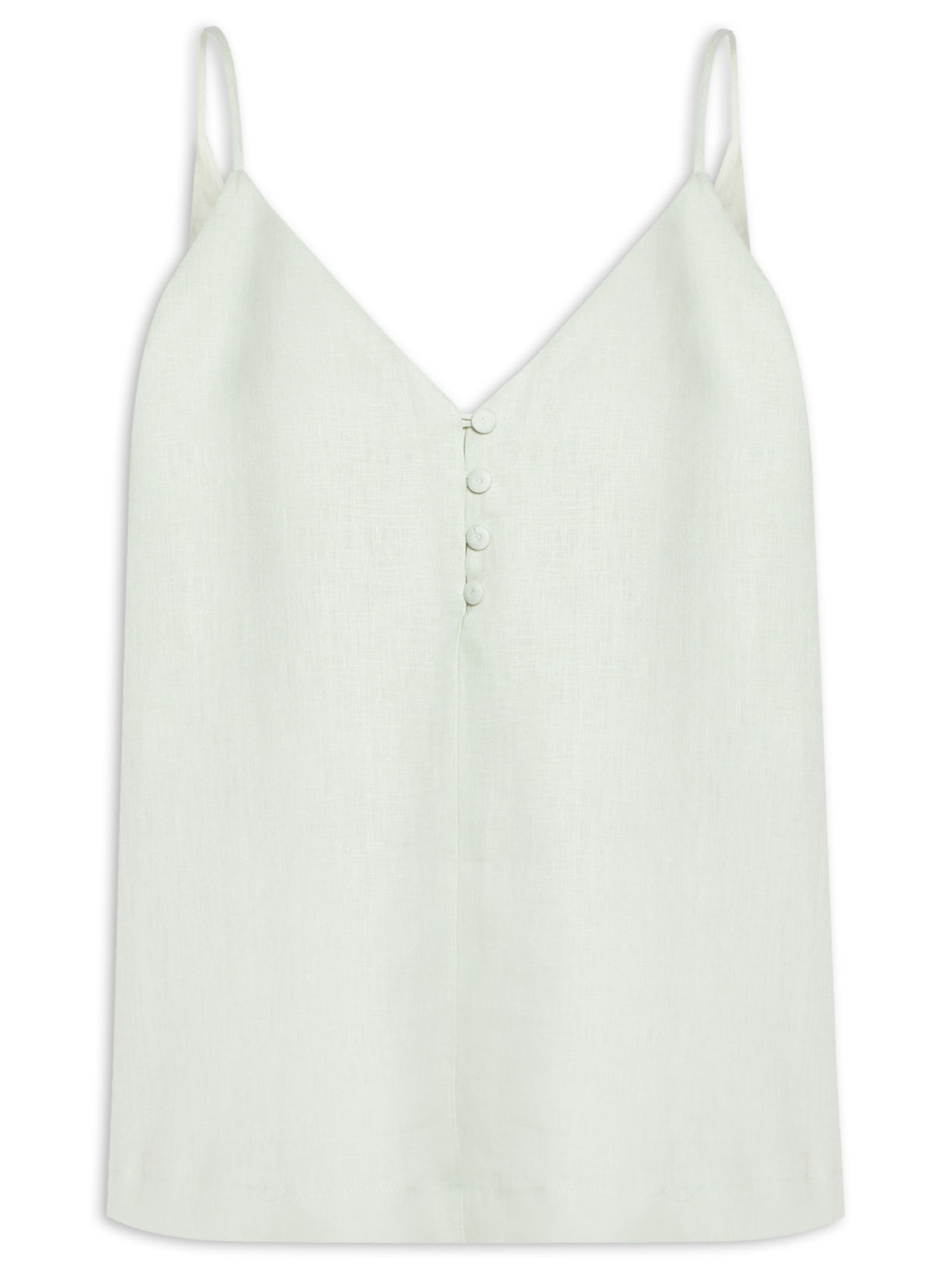 A regata verde é confeccionada em linho sem elasticidade. A peça solta ao corpo possui decote V, alças finas, botões forrados decorativos aplicados na parte frontal, faixa larga aplicada na parte interna removível por botões na parte posterior, meio forro e fechamento posterior por tiras alongadas para amarração.