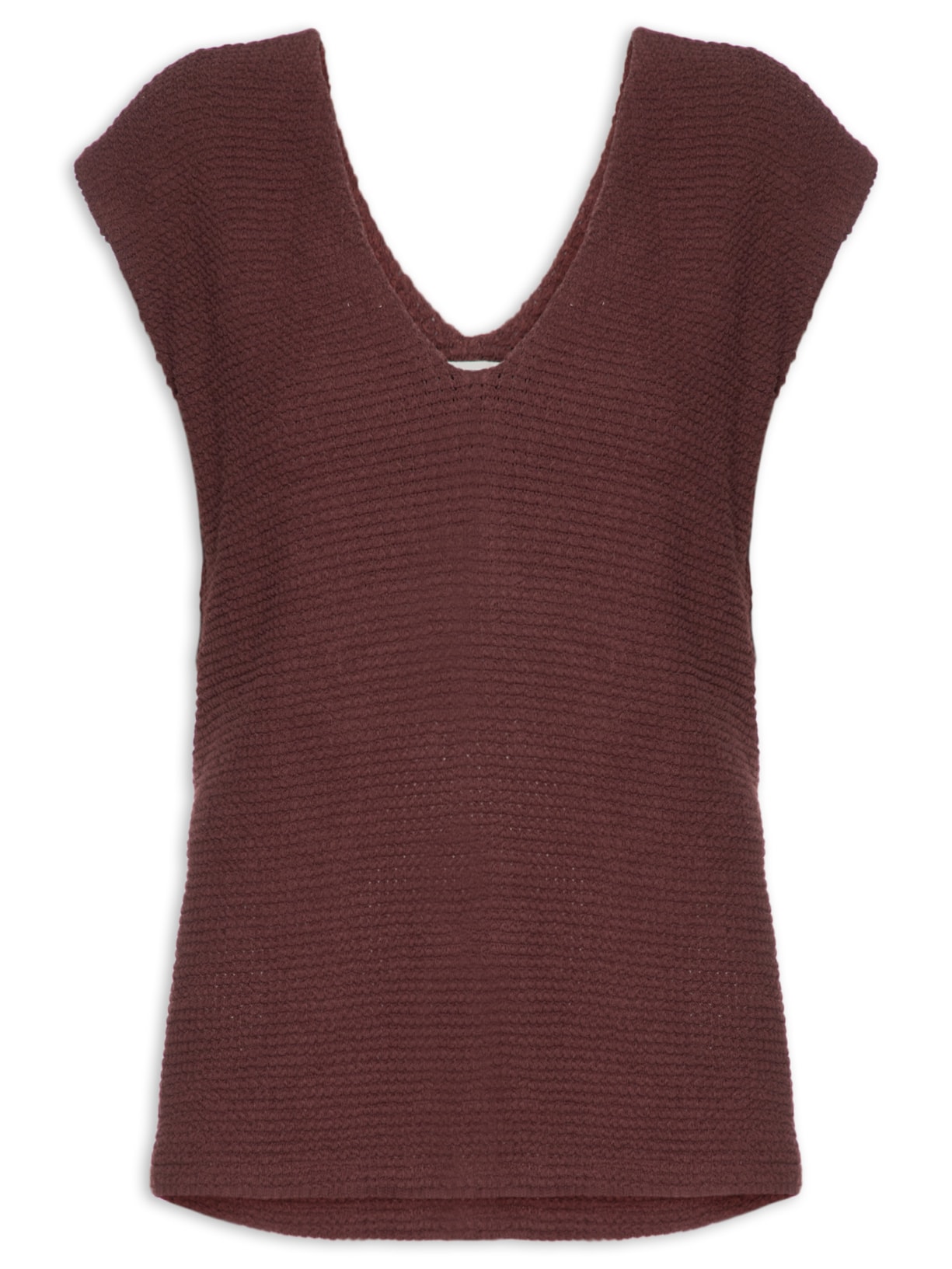A regata marrom é confeccionada em malha de algodão com superfície texturizada com média elasticidade. A peça solta ao corpo possui decote V e cavas levemente amplas.