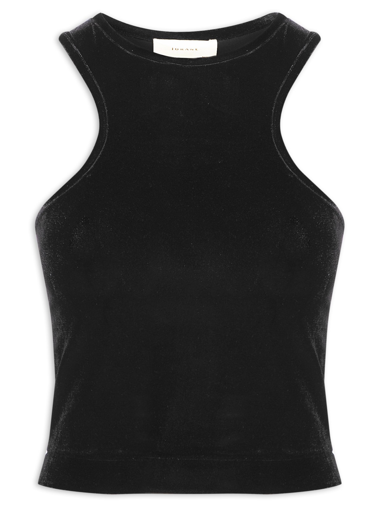A regata preta é confeccionada em veludo com média elasticidade. A peça justa ao corpo possui decote trapézio, alças médias, cavas estendidas e decote posterior nadador.