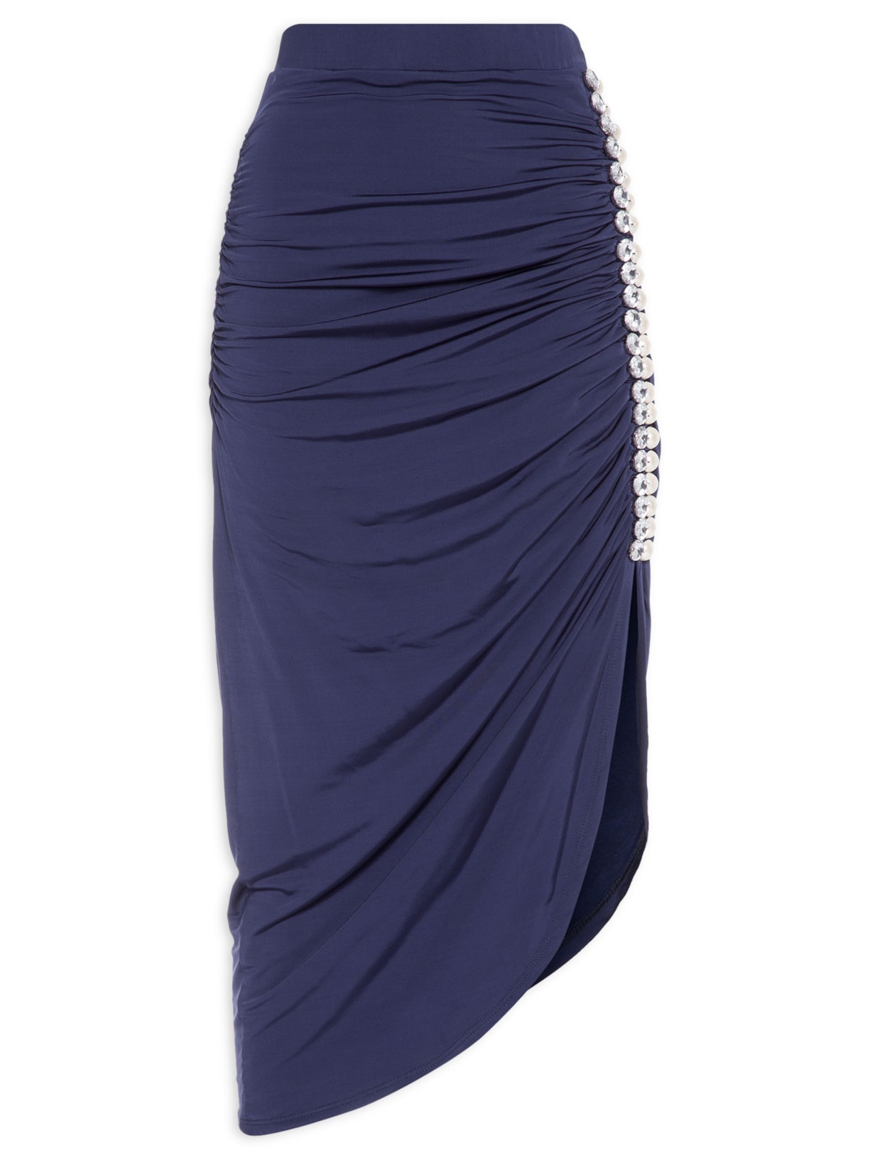 A saia azul é confeccionada em tecido leve. A peça possui cintura alta, cós com elástico embutido, drapeado frontal com aplicação de pérolas e pedraria, fenda lateral, comprimento midi, shape solto, forro, caimento reto e acabamento pespontado.