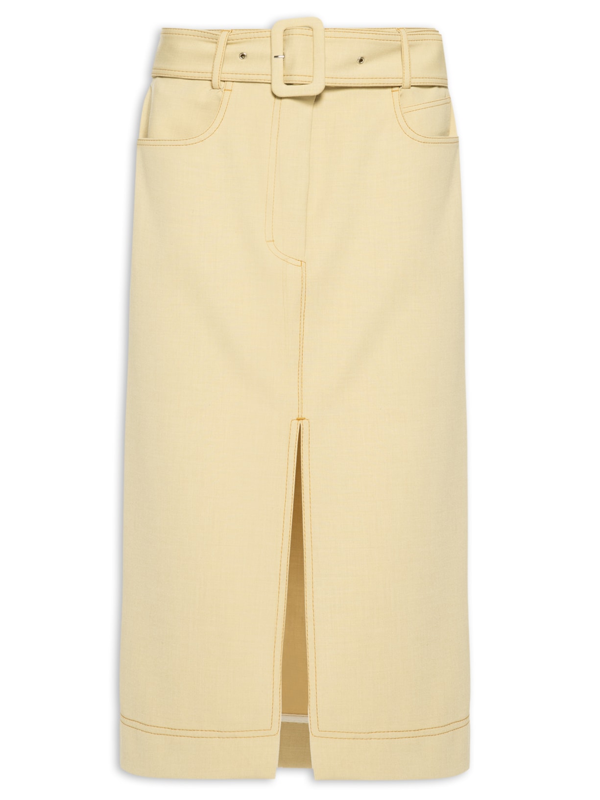 A saia bege é confeccionada em tecido leve sem elasticidade. A peça solta ao corpo possui cintura alta, cós com passantes aplicados, five pockets*, recorte posterior, fenda frontal, comprimento midi e fechamento frontal em zíper e colchetes. Acompanha cinto em tira média da mesma cor e tecido com ilhóses metálicos e fivela retangular para ajuste e uso opcional.