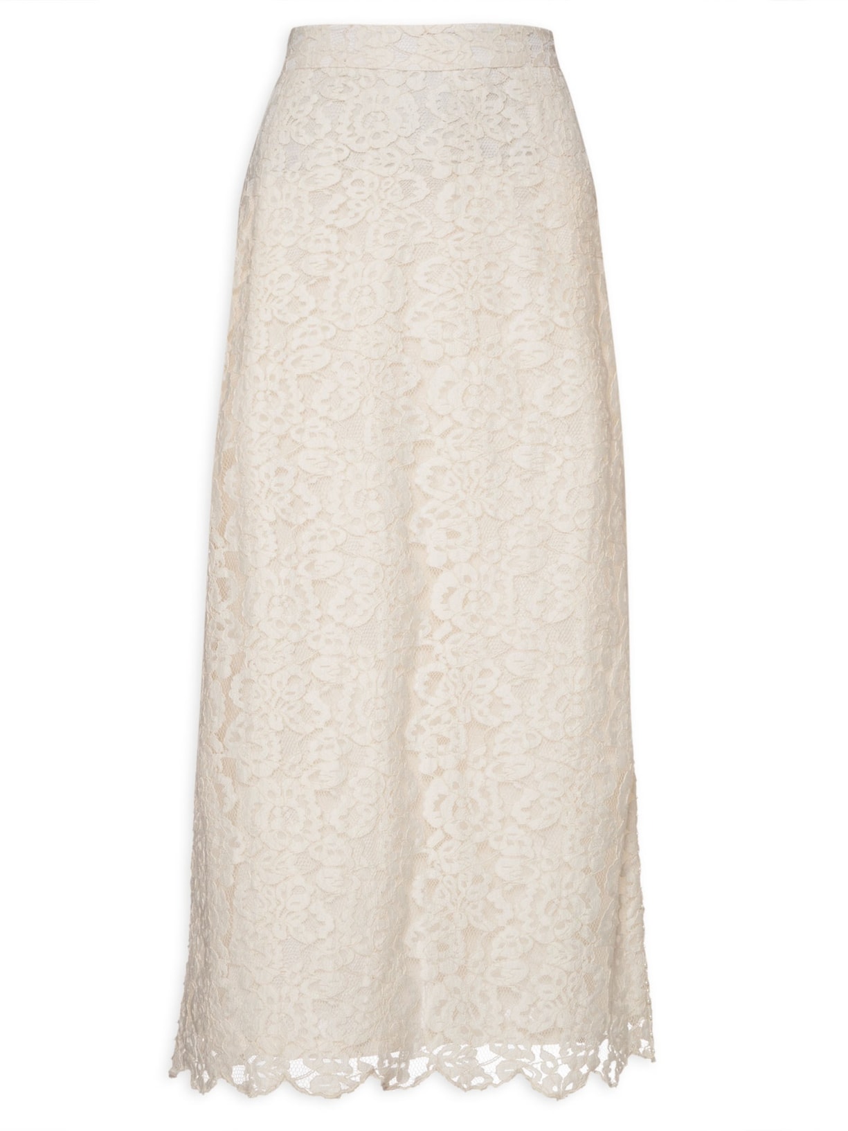 A saia off whie é confeccionada em renda leve sem elasticidade. A peça solta ao corpo, possui cintura alta, bolsos faca laterais, pérolas aplicadas nas laterais, fenda posterior com detalhes bordados aplicados em formato abstrato, padronagem floral, barra com detalhe de ondas, comprimento midi, forro e fechamento posterior por zíper invisível.