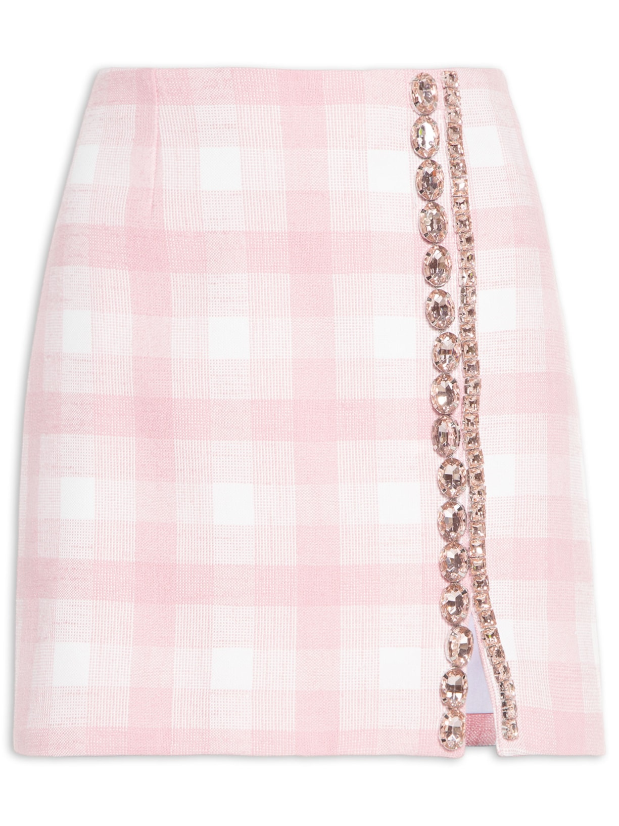 A saia rosa é confeccionada em tecido encorpado com superfície texturizada. A peça possui cintura alta, fenda frontal, forro, cristais aplicados na parte frontal, padronagem xadrez em cor contrastante, comprimento curto, shape solto, caimento reto, acabamento pespontado e fechamento posterior por zíper.
