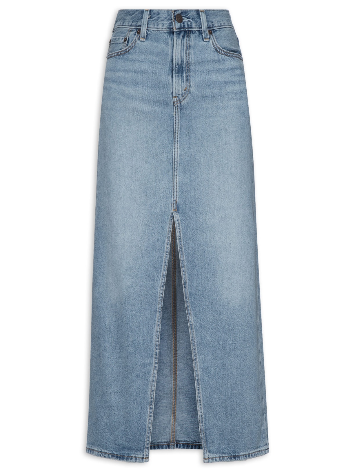 A saia azul é confeccionada em sarja com lavagem em jeans sem elasticidade. A peça possui cintura alta, cós com passantes e tag da marca bordada na parte posterior, recorte posterior, five pockets* com detalhe de rebites nos bolsos frontais, tag da marca aplicada no bolso posterior, recorte frontal com fenda, detalhe de puido na barra, efeito estonado, comprimento midi e fechamento frontal por botão e zíper.