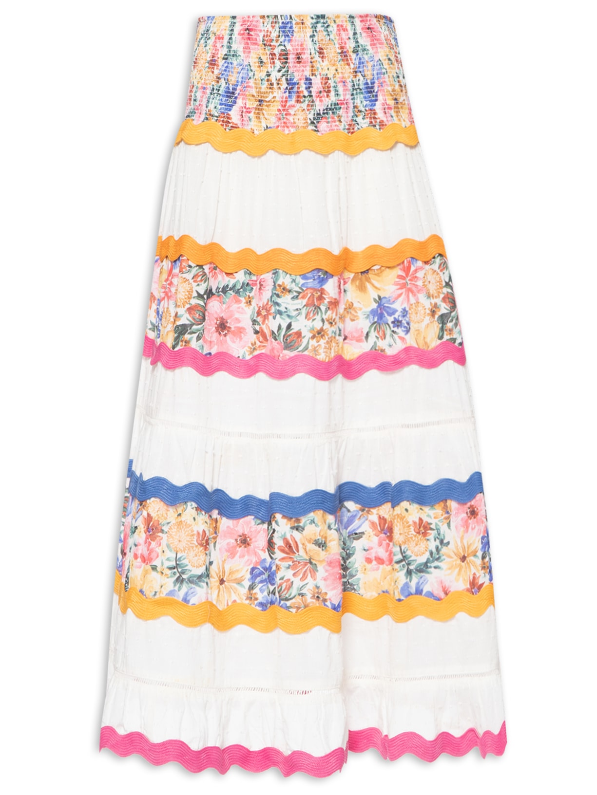 A saia rosa é confeccionada em tecido leve com superfície texturizada sem elasticidade. A peça solta ao corpo, possui cintura alta, cós largo com lastex aplicado, recortes com estampa floral em cores contrastantes, recortes em cor contrastante com padronagem de poá com superfície flocada, detalhes de passamanaria em cores contrastantes e entremeios aplicados, leve transparência, barra com leve franzido e comprimento midi.