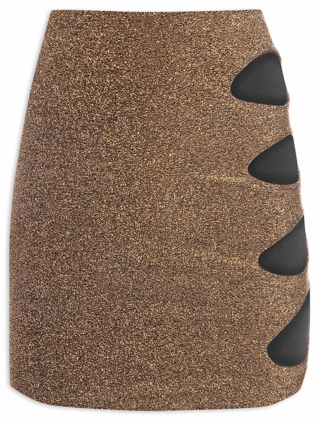 A saia dourada é confeccionado em malha de poliamida com fios de lurex. A peça possui cintura alta, cós anatômico com tag metalizada da marca aplicada na parte posterior, recortes laterais vazados, forro, comprimento curto e shape justo.