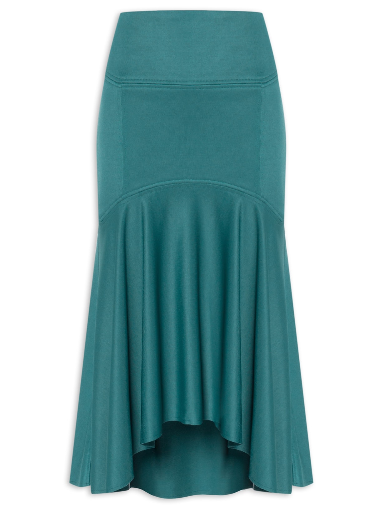 A saia verde é confeccionada em malha encorpada com alta elasticidade. A peça justa ao corpo possui cintura alta, recortes frontais e posteriores na altura do quadril, barra mullet* em peplum, comprimento midi e fechamento posterior por zíper metalizado.