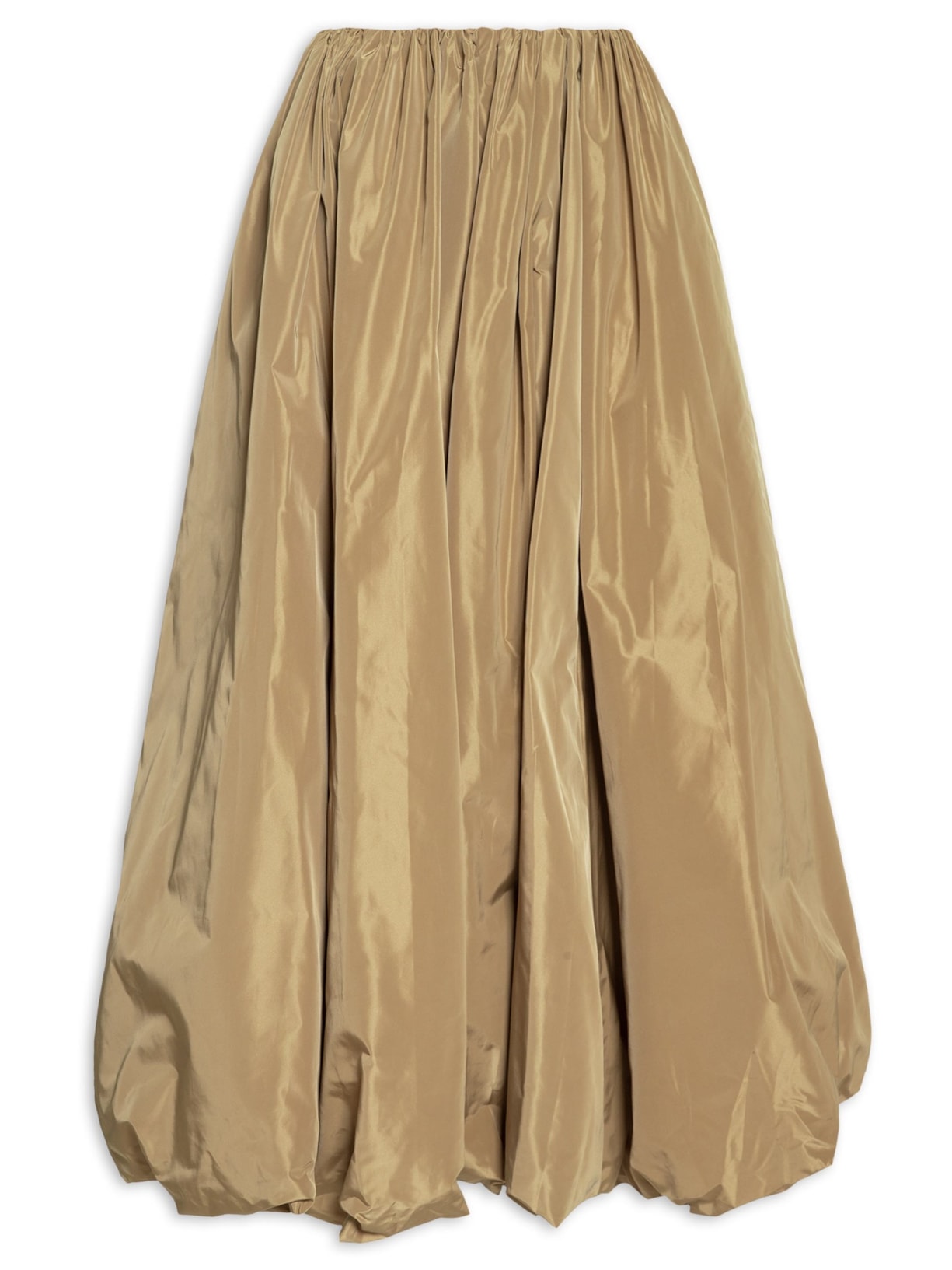 A saia longa conquistou uma nação de fashionistas que adoram um item versátil e estiloso, além de confortável é perfeito para o dia a dia. Aposte no modelo Staud ao lado de uma camiseta branca, brincos, colares delicados e finalize com sandálias a produção.
