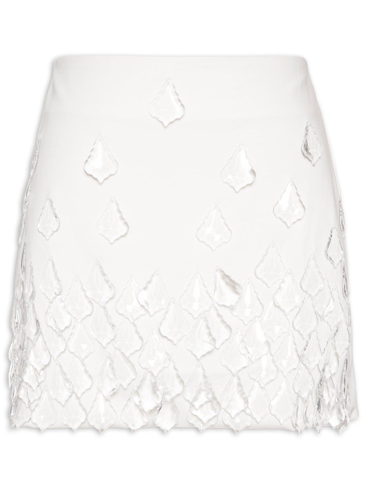A saia branca é confeccionada em tecido leve. A peça possui cintura alta, forro, pences posteriores, aplicação de pingentes transparentes com formatos figurativos na parte frontal, comprimento curto, shape solto, caimento reto, acabamento pespontado e fechamento posterior por zíper.