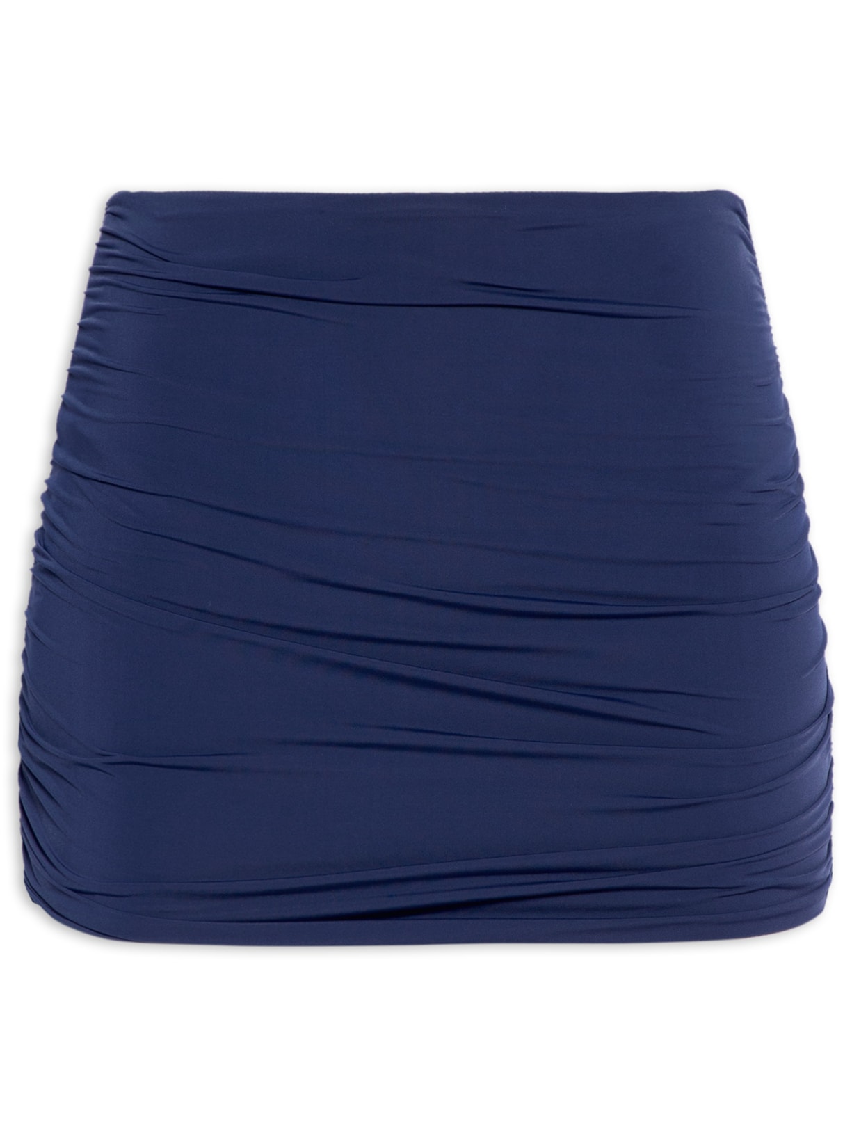 A saia azul é confeccionada em malha de poliamida com média elasticidade. A peça justa ao corpo possui cintura alta, cós com tira elástica embutida, efeito franzido nas laterais, forro, hot pant* embutida e comprimento curto.