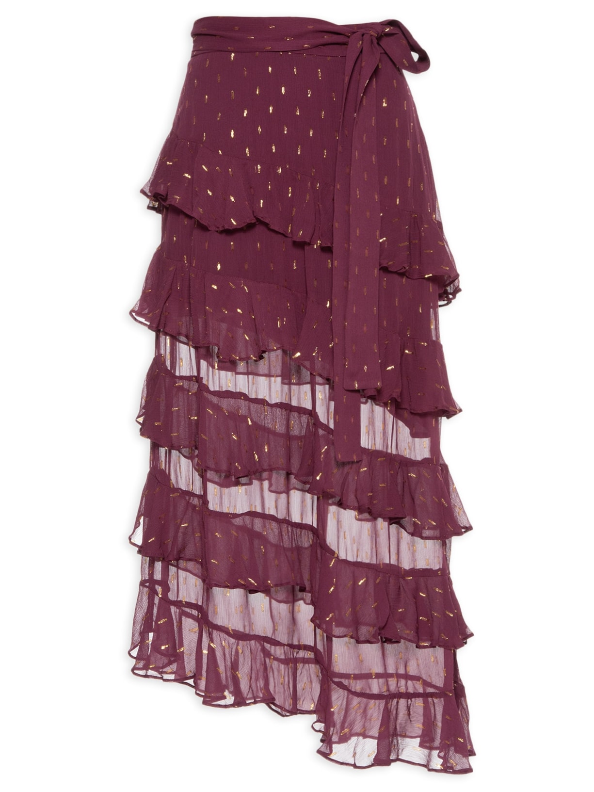 A saia vinho é confeccionada em tecido leve com fios de lurex e sem elasticidade. A peça solta ao corpo possui cintura alta, detalhe de aplicações de babados assimétricos, forro curto, transparência, passante lateral, comprimento midi e fechamento lateral por zíper invisível. Acompanha faixa de espessura média da mesma cor e tecido para uso opcional.