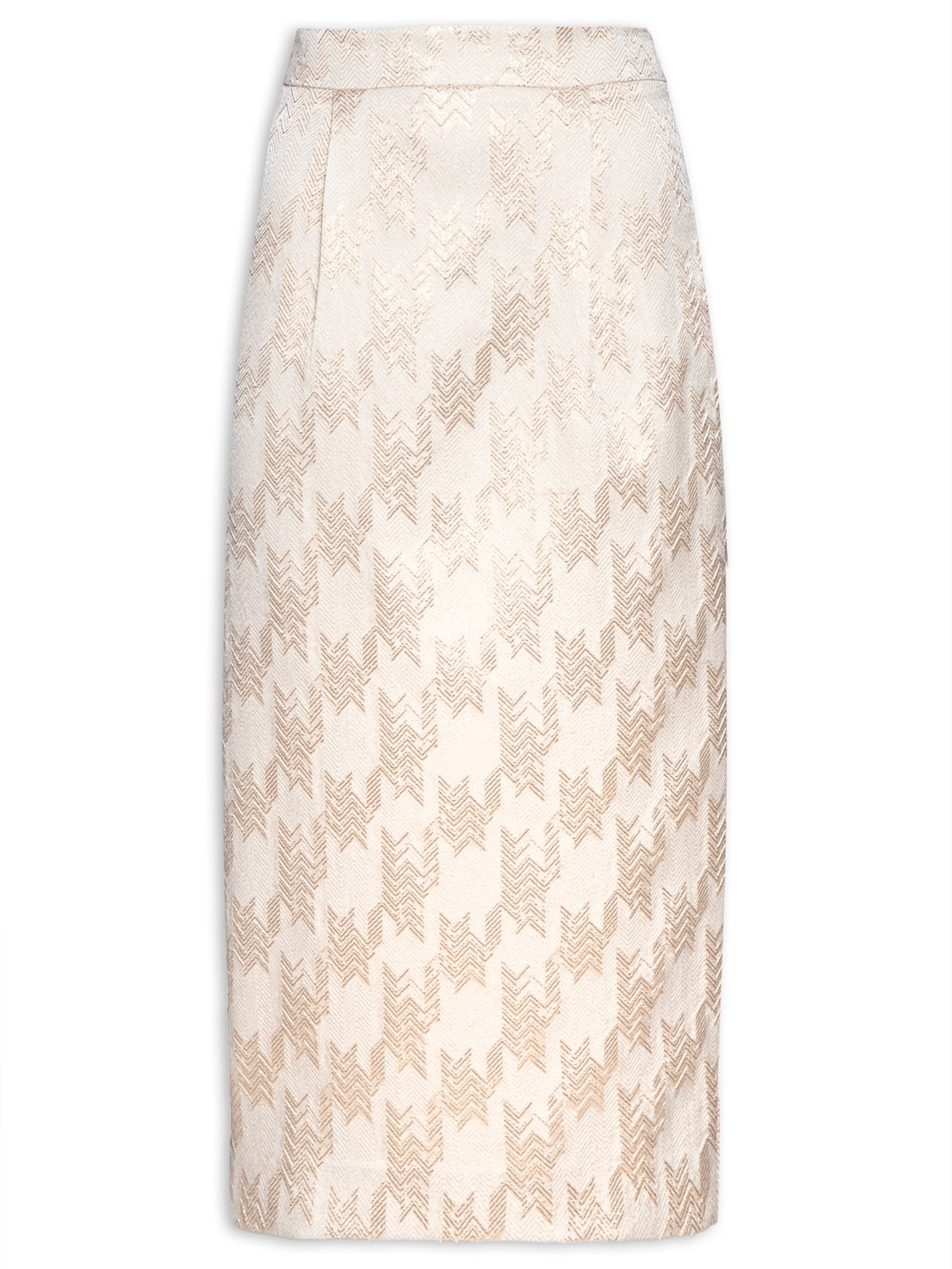 A saia bege é confeccionada em tecido encorpado com fios de lurex sem elasticidade. A peça solta ao corpo possui cintura alta, pregas frontais, fenda posterior, forro, comprimento midi e fechamento lateral por zíper invisível.