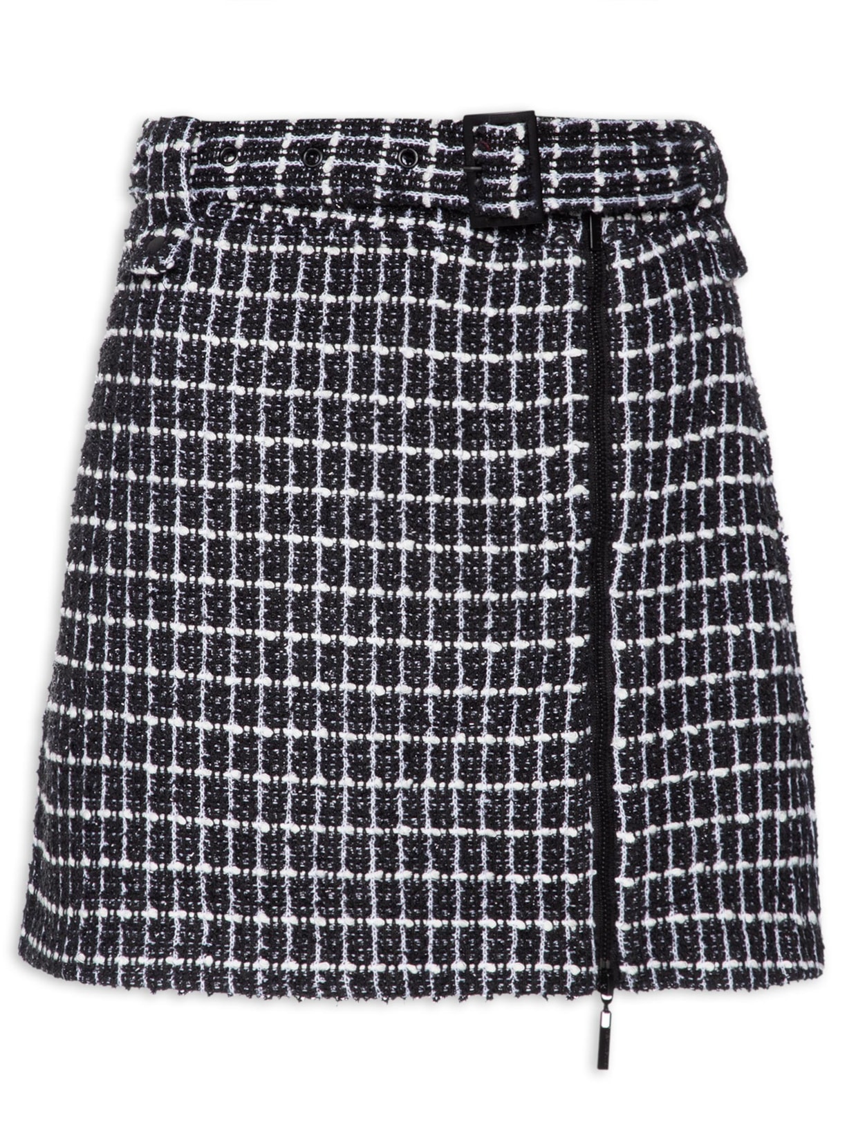 A saia preta é confeccionada em tweed com alta elasticidade. A peça solta ao corpo possui cintura alta, cós com passantes, bolsos posteriores decorativos, tag da marca aplicada em metal na parte posterior, forro, comprimento curto e fechamento frontal por zíper. Acompanha cinto no mesmo tecido para uso opcional.