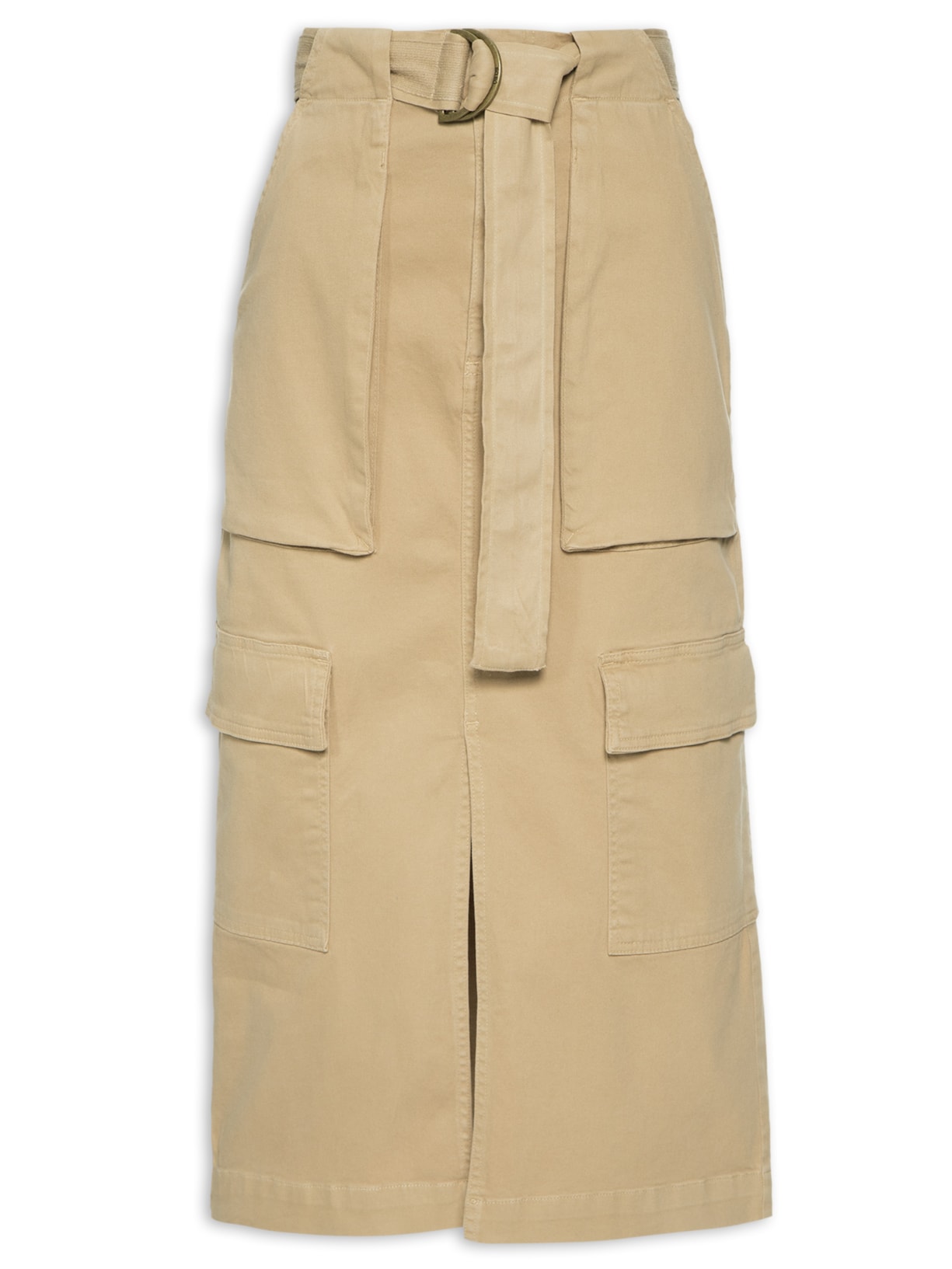 A saia bege é confeccionada em sarja sem elasticidade. A peça solta corpo possui cintura alta, cós com passantes aplicados, bolsos frontais de modelo faca, fenda frontal, bolsos laterais de modelo cargo, bolsos posteriores com logo da marca bordado na parte posterior, pences posteriores, comprimento midi e fechamento frontal em zíper e botão. Acompanha cinto em tira média da mesma cor e tecido com fivela dupla metalizada para ajuste e uso opcional.
