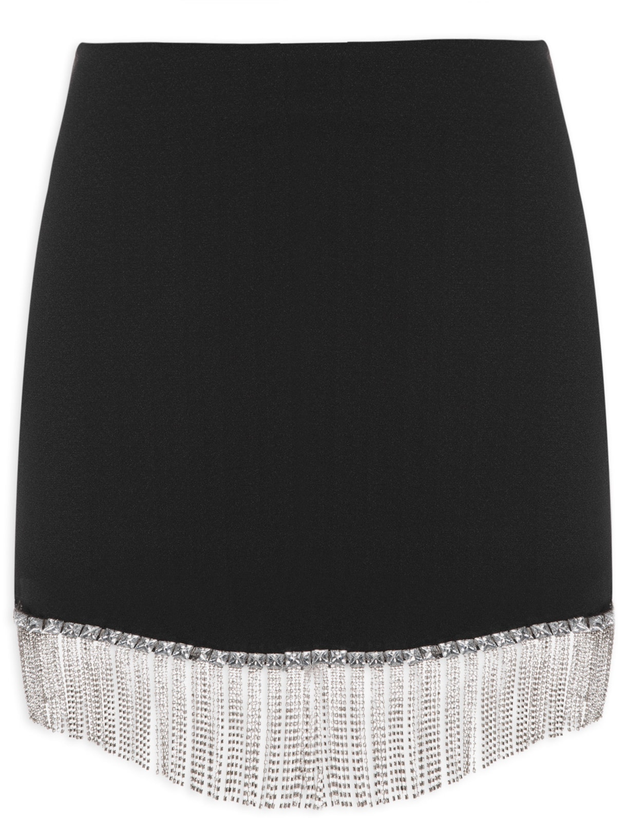 A saia preta é confeccionada em crepe. A peça possui cintura alta, pences posteriores, recorte posterior, aplicação na altura da barra de pedrarias e franjas em strass, comprimento curto, forro, caimento reto, acabamento pespontado e fechamento posterior por zíper invisível.