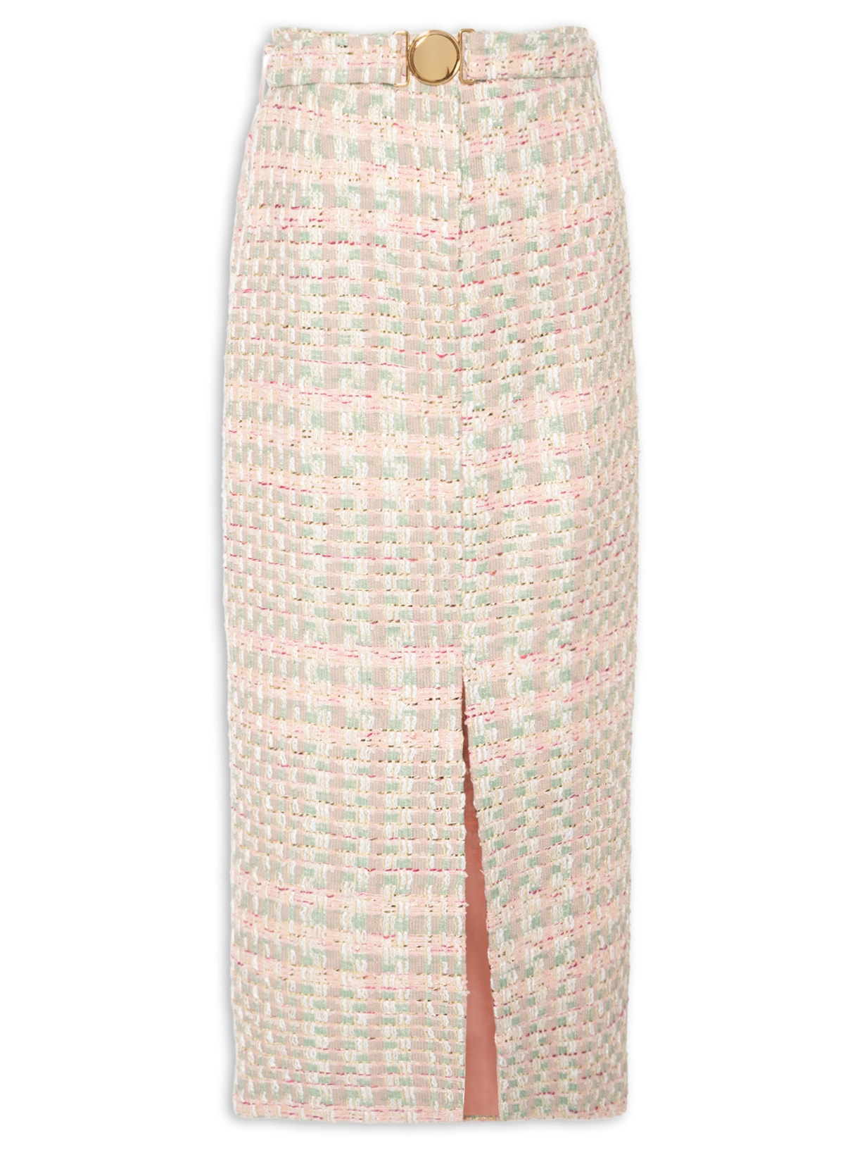 A saia rosa é confeccionada em tweed com fios mesclados de cores contrastantes e sem elasticidade. A peça levemente justa até o quadril possui cintura alta, passantes em fitilho aplicados nas laterais e na parte posterior, fenda frontal, comprimento midi, forro e fechamento frontal por zíper com vista sobreposta. Acompanha cinto da mesma cor e tecido com elástico embutido e fivela em metal dourada para encaixe de fechamento.
