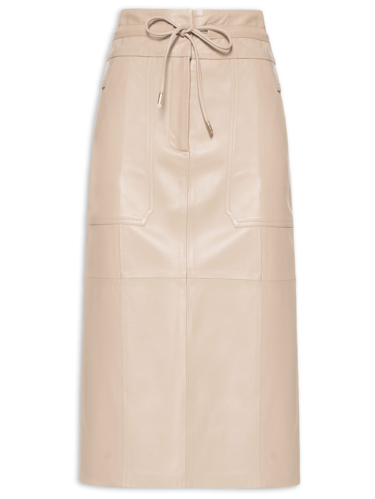 A saia bege é confeccionada em couro sem elasticidade. A peça solta ao corpo possui cintura alta, cós amplo com tira alongada embutida e elástico na parte posterior, bolsos frontais modelo faca, bolsos posteriores embutidos decorativos, recortes frontais e posteriores, fenda posterior, vista sobreposta nas laterais, comprimento midi e fechamento frontal por botões de pressão e zíper.