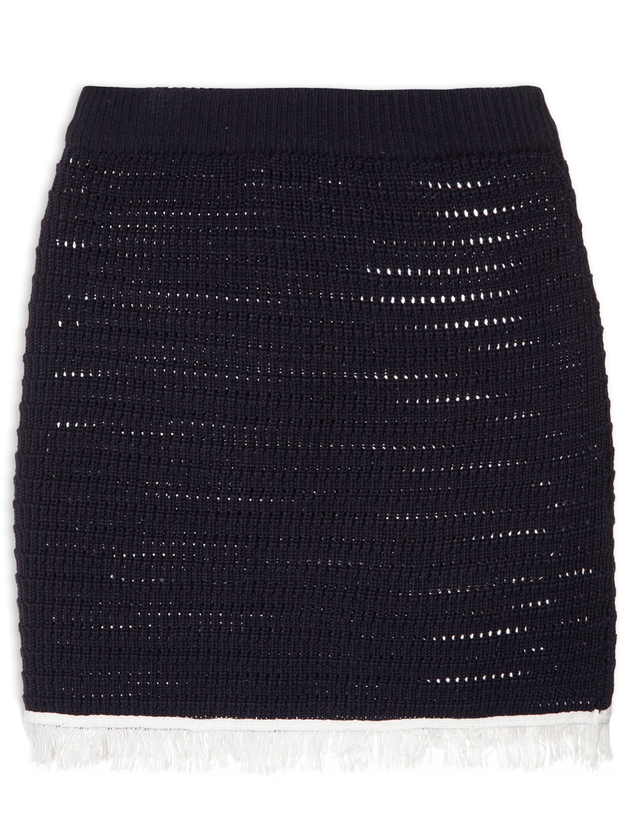 A saia azul marinho é confeccionada em tricot. A peça possui cintura alta, cós com elástico embutido, franjas aplicadas na barra em cor contrastante, comprimento mini, shape justo, caimento reto e acabamento canelado.