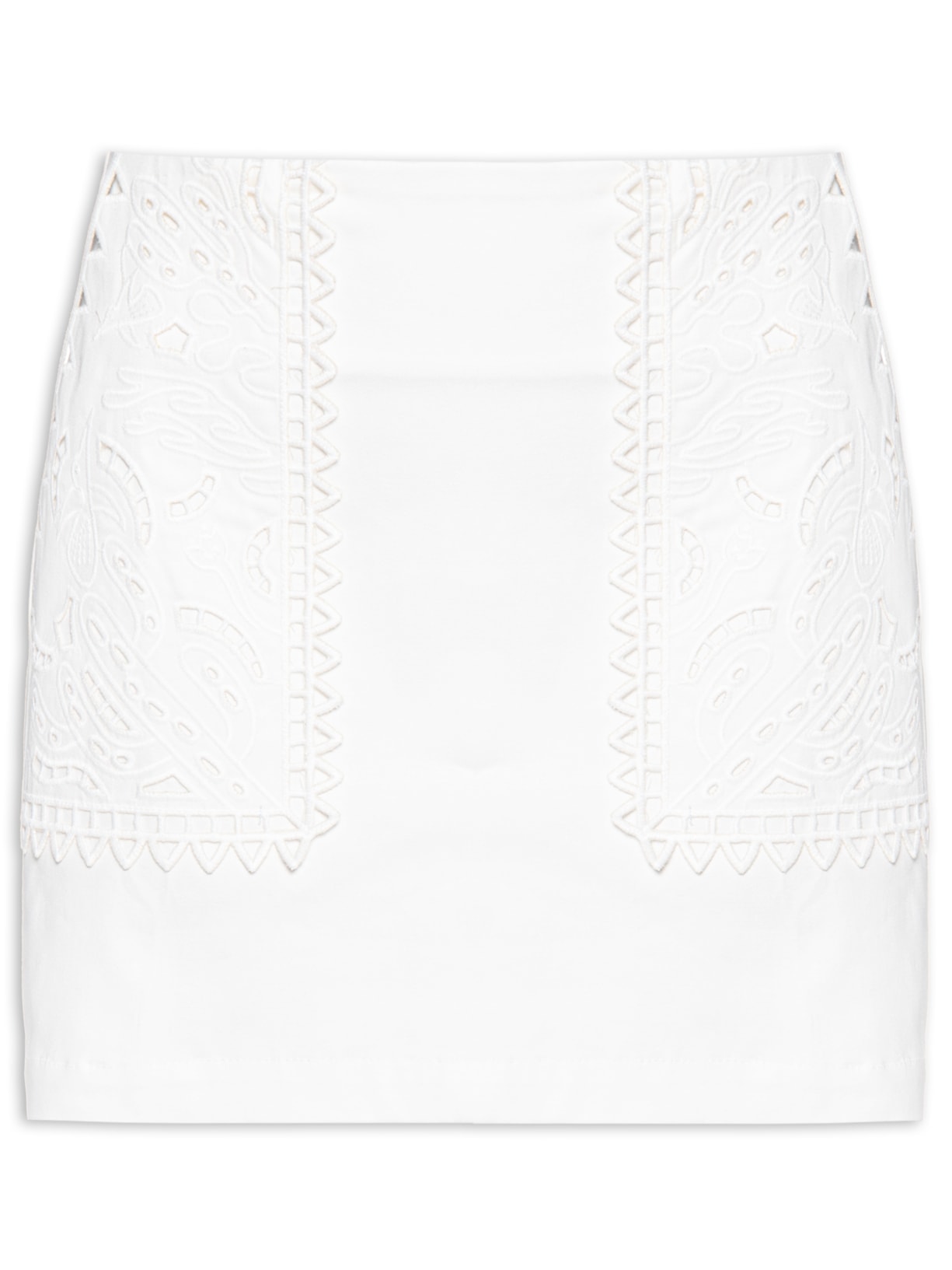 A saia off white é confeccionada em sarja leve de baixa elasticidade. A peça solta ao corpo possui cintura alta, bolsos frontais de modelo faca com aplicação de bordados figurativos em recortes vazados, pences posteriores, comprimento curto e fechamento posterior por zíper invisível.