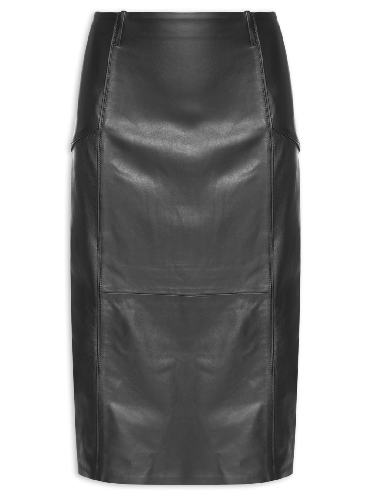 A saia preta é confeccionada em couro sem elasticidade. A peça justa ao corpo possui cintura alta, cós com passantes aplicados, recortes frontais e posteriores, recorte com fenda posterior, comprimento midi e fechamento posterior por zíper invisível.
