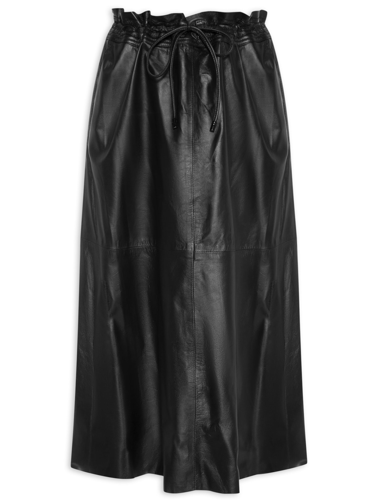 A saia preta é confeccionada em couro. A peça possui cintura alta, cós com recortes e com cordão embutido para amarração frontal, recortes frontais e posteriores, bolsos frontais modelo faca, comprimento midi, shape solto, caimento reto e acabamento pespontado.
