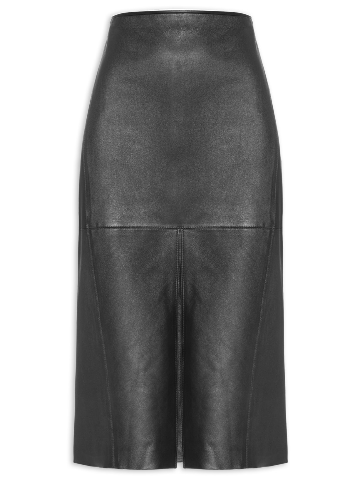 A saia preta é confeccionada em couro sem elasticidade. A peça justa ao corpo possui cintura alta, recortes posteriores e frontais, fenda frontal, comprimento midi e fechamento posterior por zíper invisível.