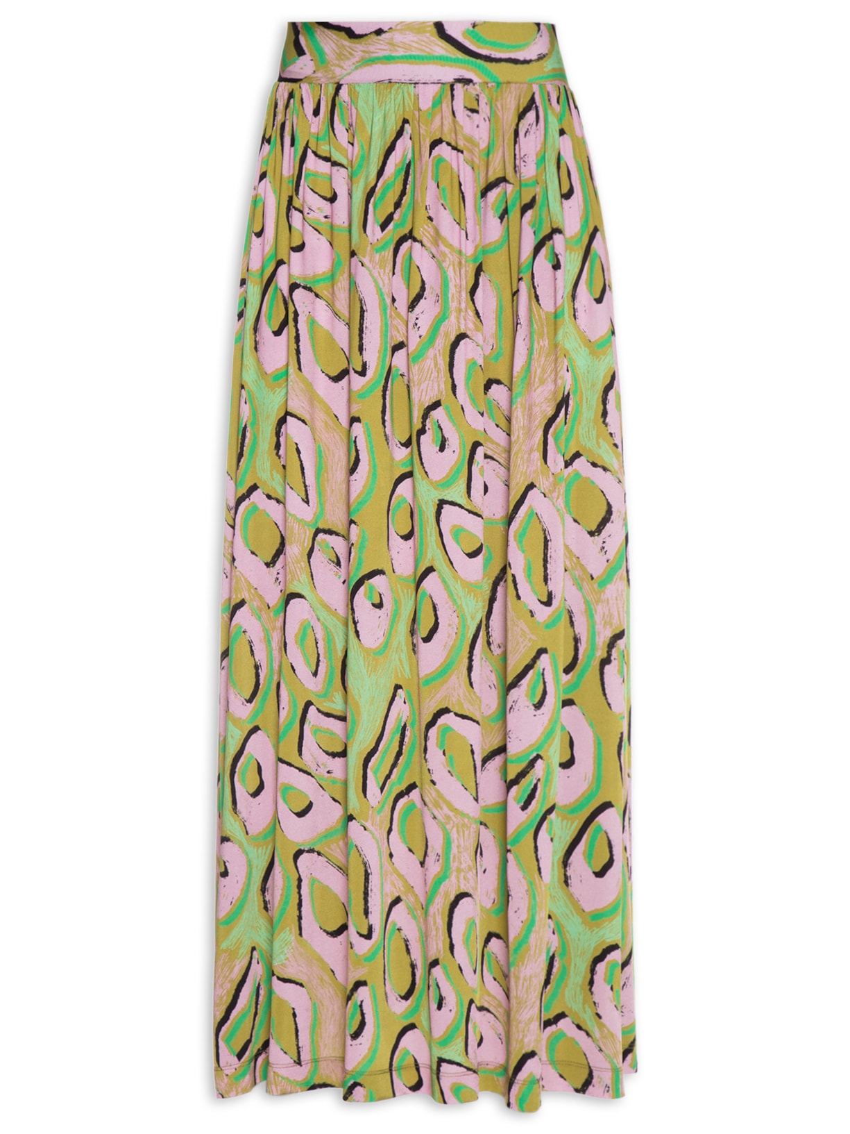 A saia verde é confeccionada em malha. A peça possui cintura alta, cós com faixa elástica embutida e detalhes de franzidos frontais e posteriores, estampa abstrata em cores contrastantes, comprimento longo, shape solto, caimento reto e acabamento pespontado.