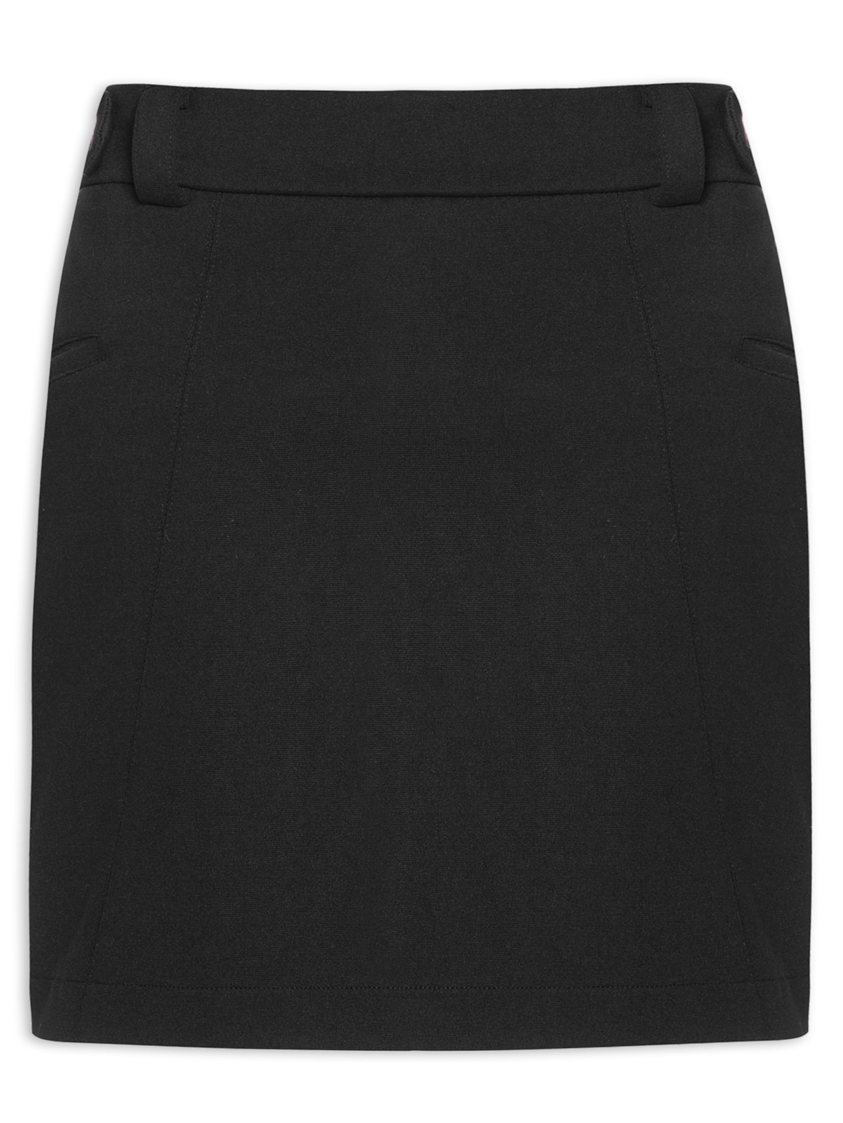 A saia preta é confeccionada em malha encorpada com alta elasticidade. A peça solta ao corpo possui cintura alta, cós com passantes aplicados e martingales laterais com fechamento por botões de pressão, bolsos frontais embutidos, pences posteriores, forro, comprimento curto e fechamento posterior por zíper metalizado com puxador.