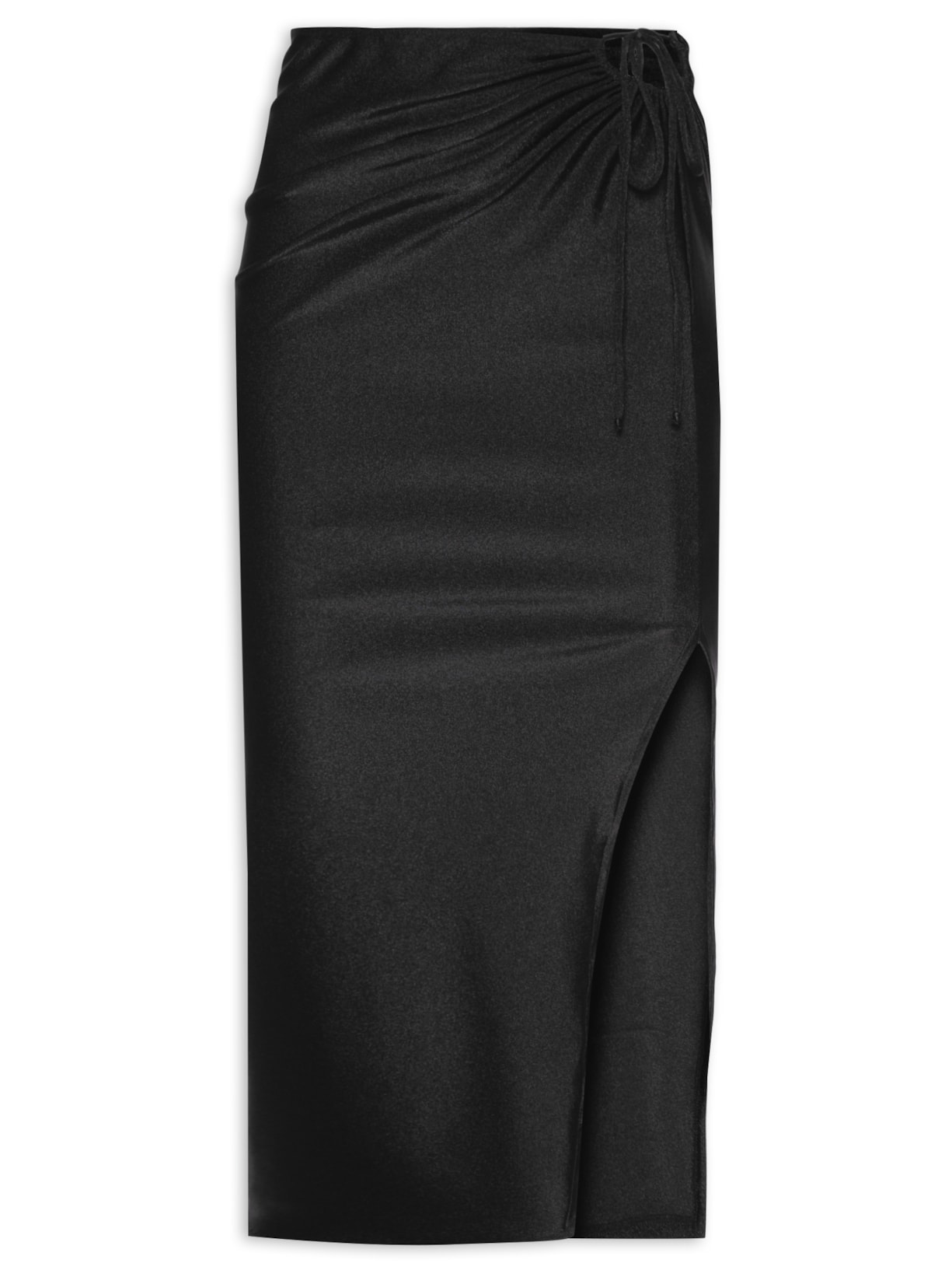A saia preta é confeccionada em malha cirrê de média elasticidade. A peça justa ao corpo possui cintura alta, recorte frontal vazado com tira alongada embutida para amarração, fenda frontal e comprimento midi.