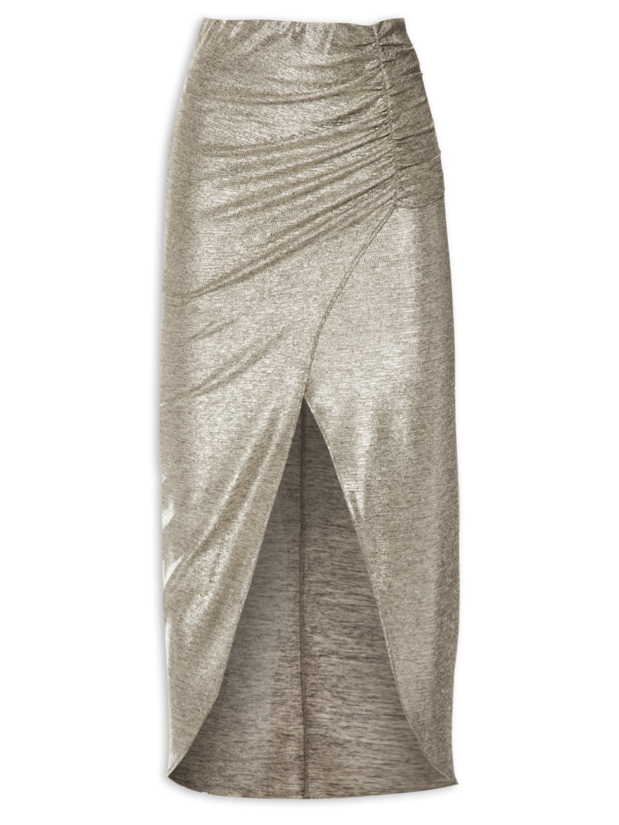 A saia dourada é confeccionada em malha leve com superfície metalizada e alta elasticidade. A peça justa ao corpo possui cintura alta, recorte frontal sobreposto com recorte assimétrico e detalhe drapeado, fenda frontal, comprimento midi e fechamento posterior por zíper invisível.