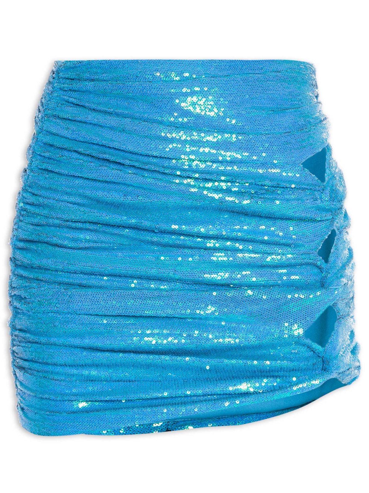 A saia azul é confeccionada em tecido leve com superfície em mini paetê furta cor. A peça possui cintura alta, franzidos nas laterais e parte posterior, detalhe frontal de nó e recorte vazado, forro, comprimento curto, shape justo, acabamento pespontado e fechamento posterior por zíper invisível.