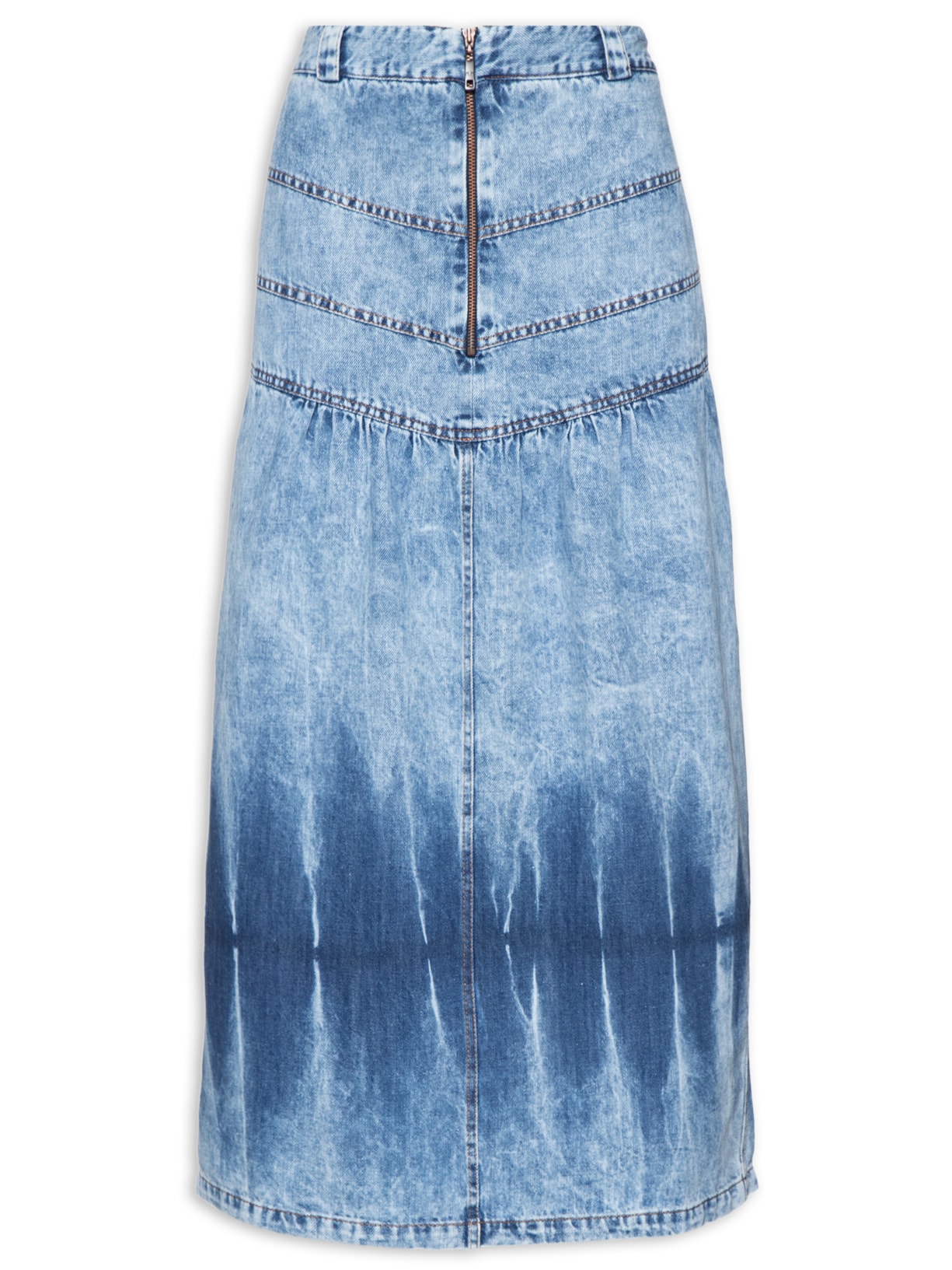 A saia azul é confeccionada em sarja com lavagem jeans sem elasticidade. A peça solta ao corpo possui cintura alta, cós com passantes aplicados, recortes frontais e posteriores, bolsos frontais embutidos, fenda posterior, recorte no comprimento com detalhe de franzido, efeito estonado, comprimento midi e fechamento frontal por zíper metálico.