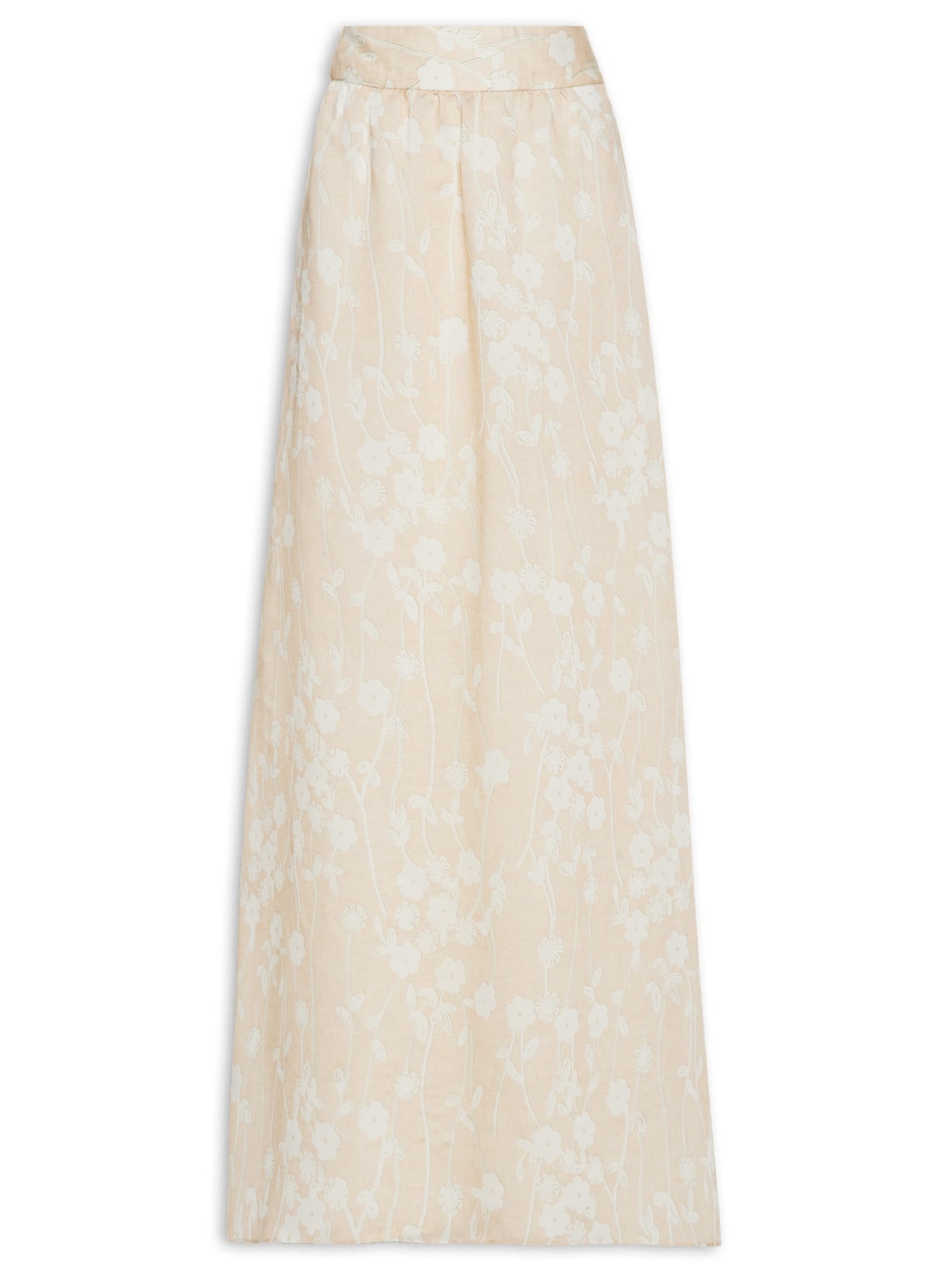 A saia bege é confeccionada em tecido leve sem elasticidade. A peça solta ao corpo possui cintura altas, cós largo, leve franzido na cintura, padronagem floral em cor contrastante, comprimento longo e fechamento lateral por zíper invisível.