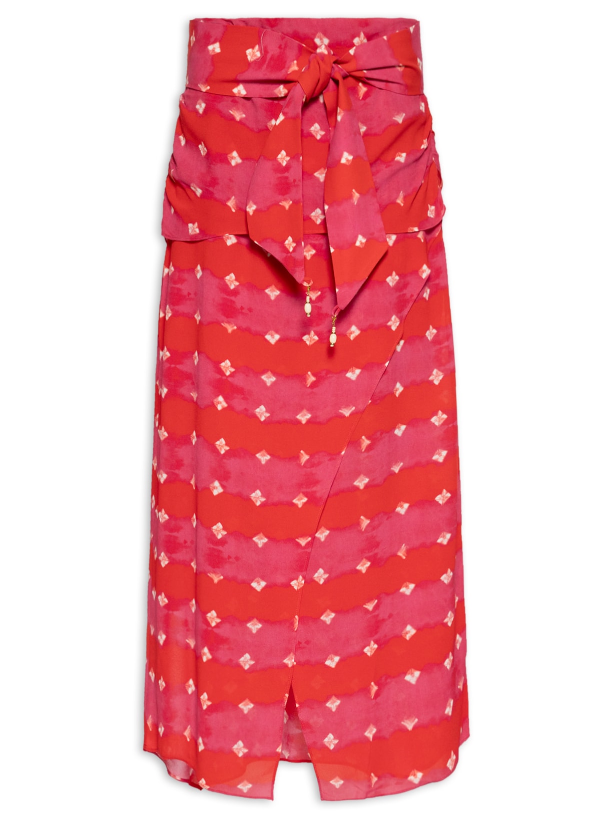 A saia vermelha é confeccionada em crepe sem elasticidade. A peça solta ao corpo possui cintura alta, recorte frontal e posterior sobrepostos com detalhe de franzidos laterais, meio forro, leve transparência, recorte frontal sobreposto com fenda, estampa abstrata em cores contrastantes, comprimento midi e fechamento lateral por zíper invisível. Acompanha faixa no mesmo tecido e cor para uso opcional.