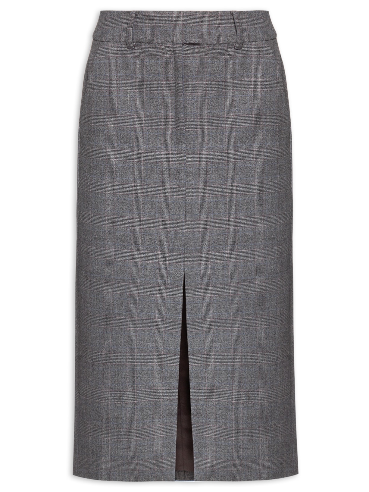 A saia cinza é confeccionada em tecido leve sem elasticidade. A peça solta ao corpo possui cintura alta, cós com passantes aplicados, fenda na parte frontal ao meio, padronagem xadrez em cor contrastante preto, comprimento midi e fechamento frontal por zíper e colchete.