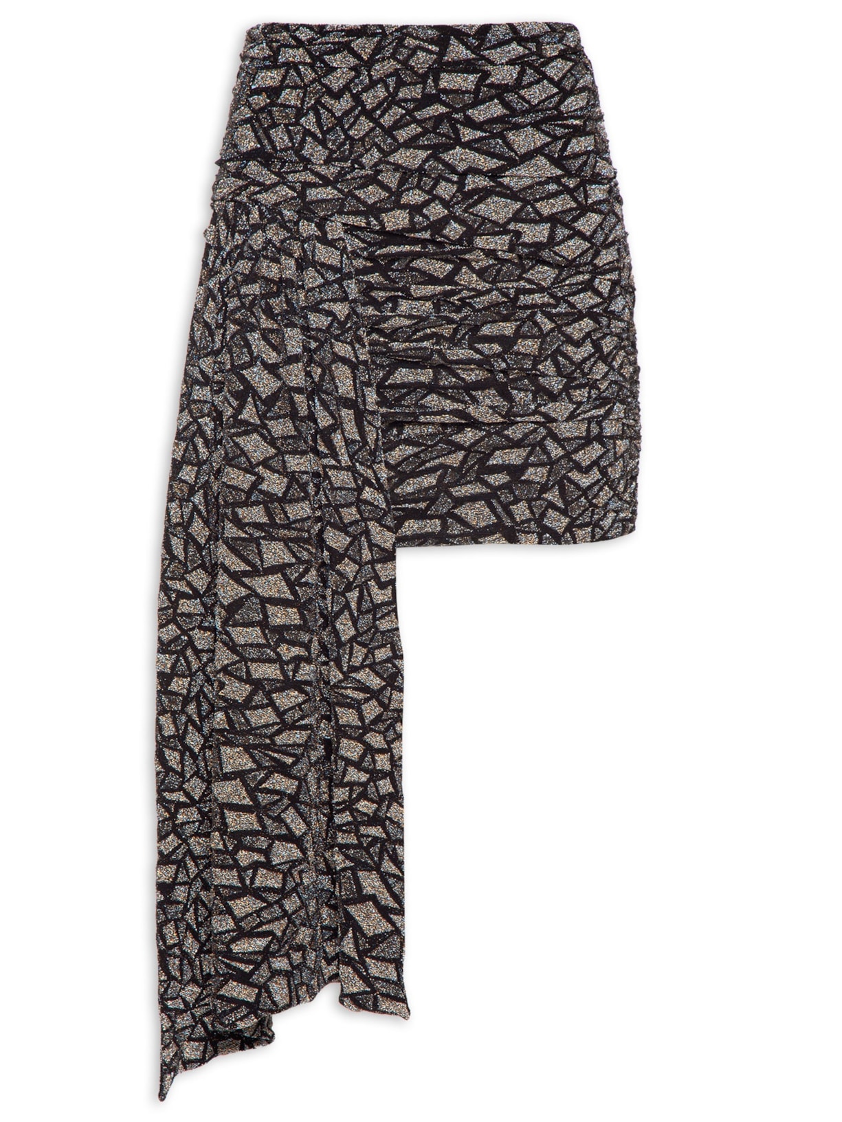 A saia preta, é confeccionada em jersey de média elasticidade. A peça justa ao corpo, possui cintura alta, cós com elástico embutido, detalhe sobreposto frontal e posterior com faixa estendida aplicada, franzido nas laterais, padronagem geométrica em lurex de cores contrastantes, comprimento curto e forro.