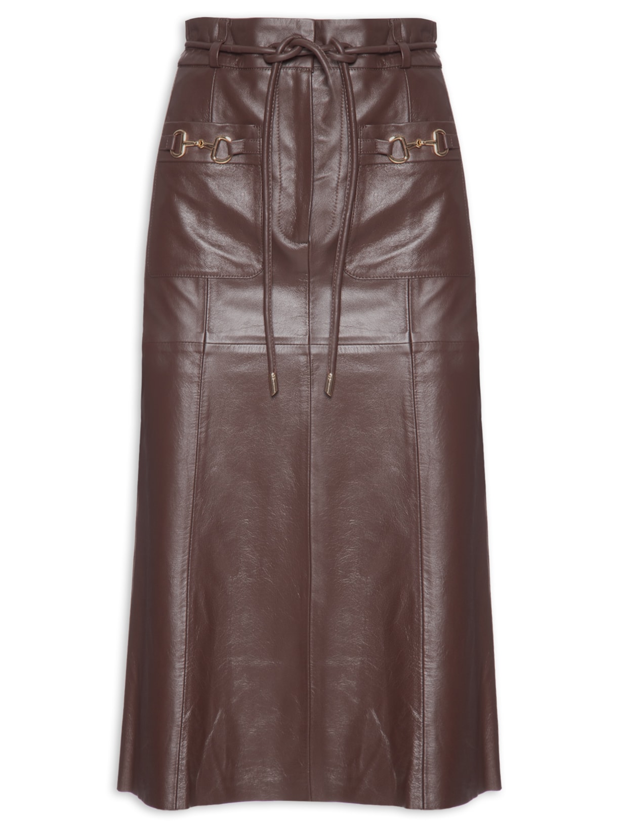 A saia marrom é confeccionada em couro sem elasticidade. A peça solta ao corpo possui cintura alta, cós com passantes, recortes posteriores e frontais, bolsos posteriores decorativos, bolsos frontais com tira média sobreposta e aviamento metálico, meio forro, comprimento midi e fechamento frontal por botão de pressão encapado e zíper. Acompanha cinto para uso opcional com espessura fina e ponteiras metálicas.