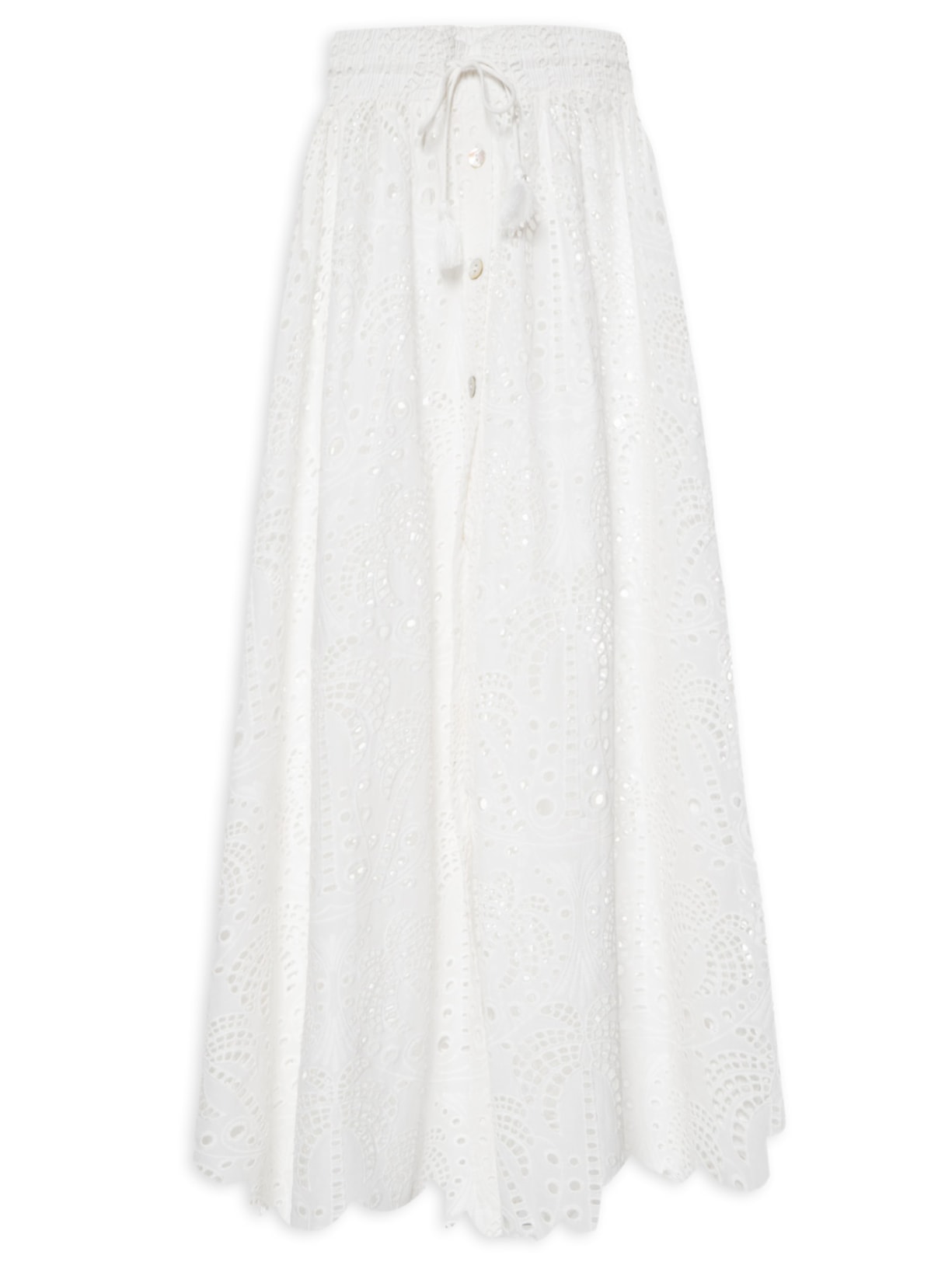 Peças em laise trazem um frescor e delicadeza para o visual. Além de trazer um toque artesanal, a saia midi da Farm fica super estilosa ao lado de um maiô preto, sandálias brancas e brincos metalizados.