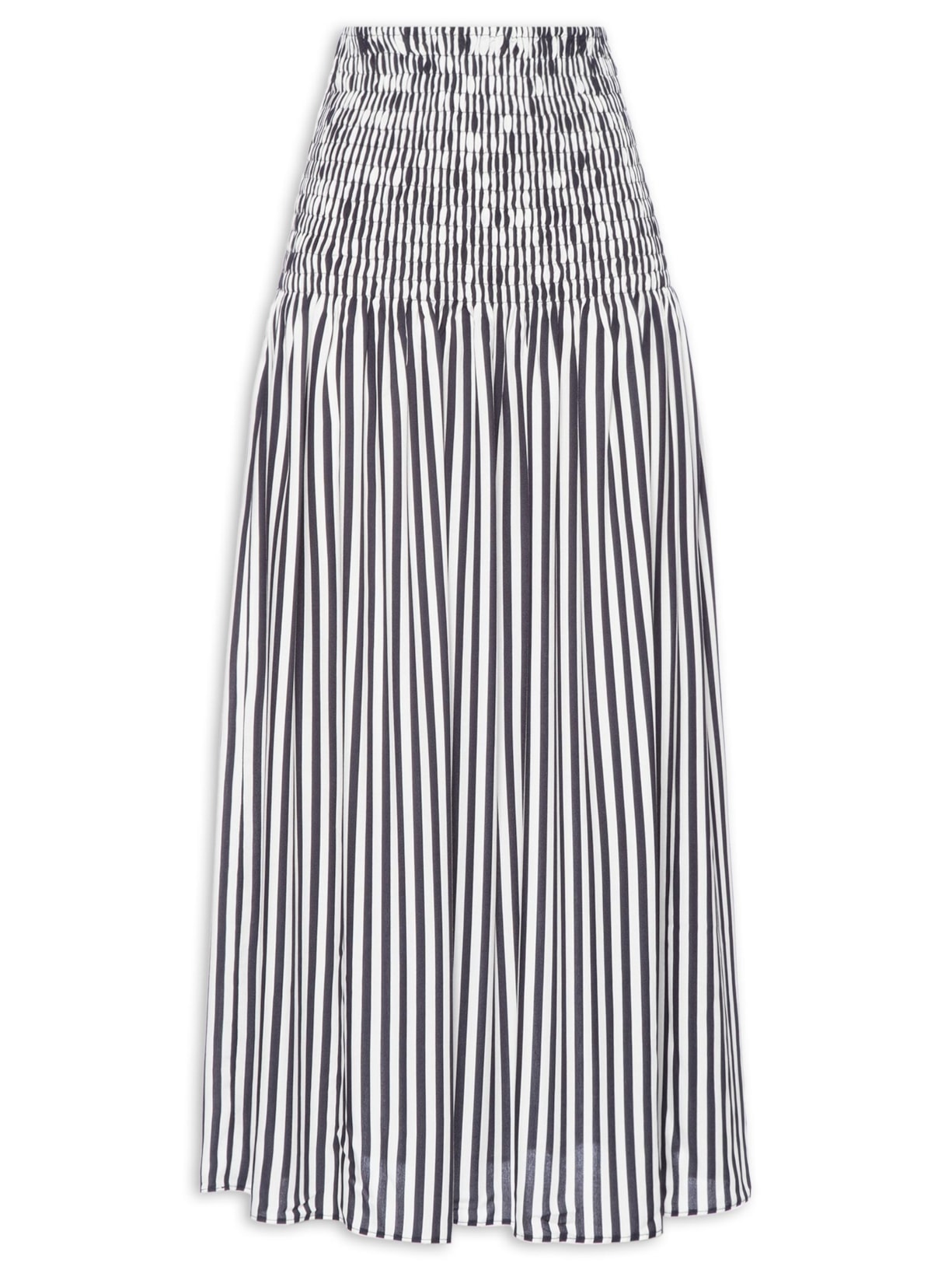 Adoramos a saia longa da '2Essential, as listras dão destaque à peça e alongam a silhueta. Complete com um top da mesma padronagem, sandálias birken e brincos alongados para um toque elegante.