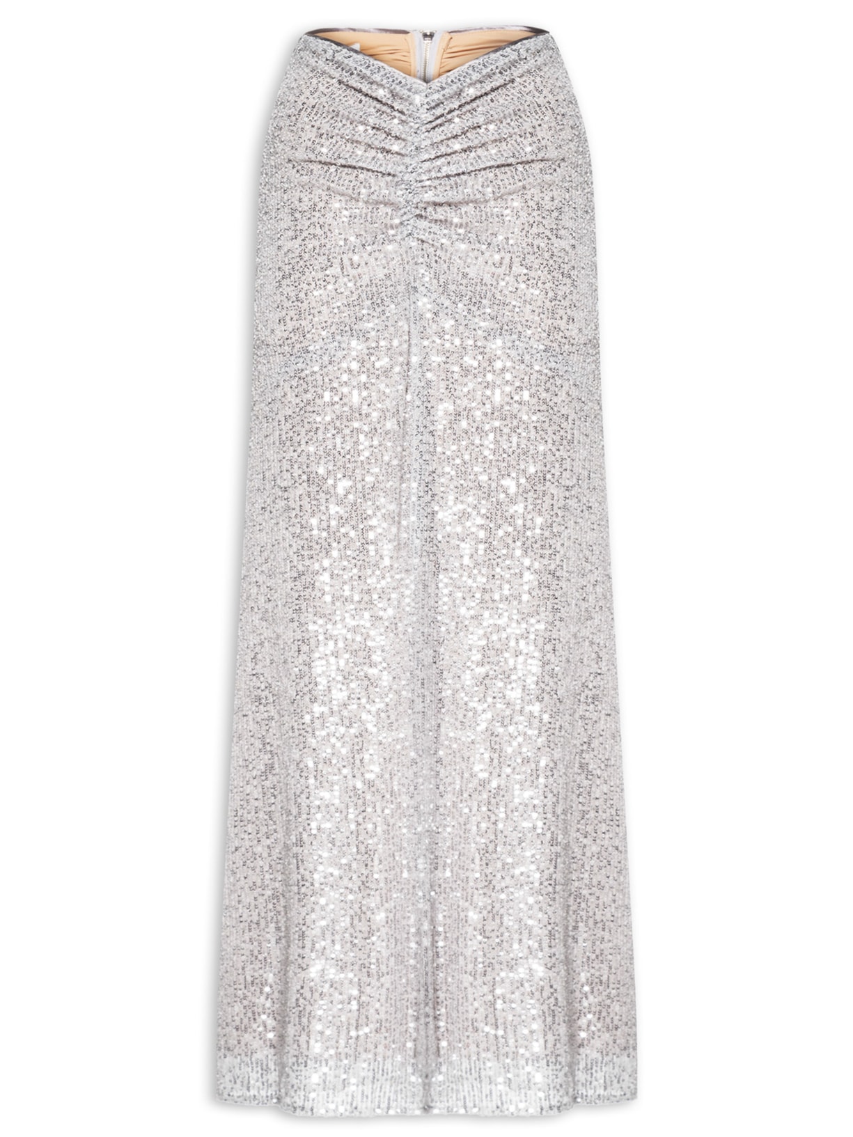 A saia prata é confeccionada em tecido leve com superfície em paetês de média elasticidade. A peça solta ao corpo possui cintura baixa, efeito franzido na parte frontal, transparência, comprimento longo e fechamento posterior por zíper.