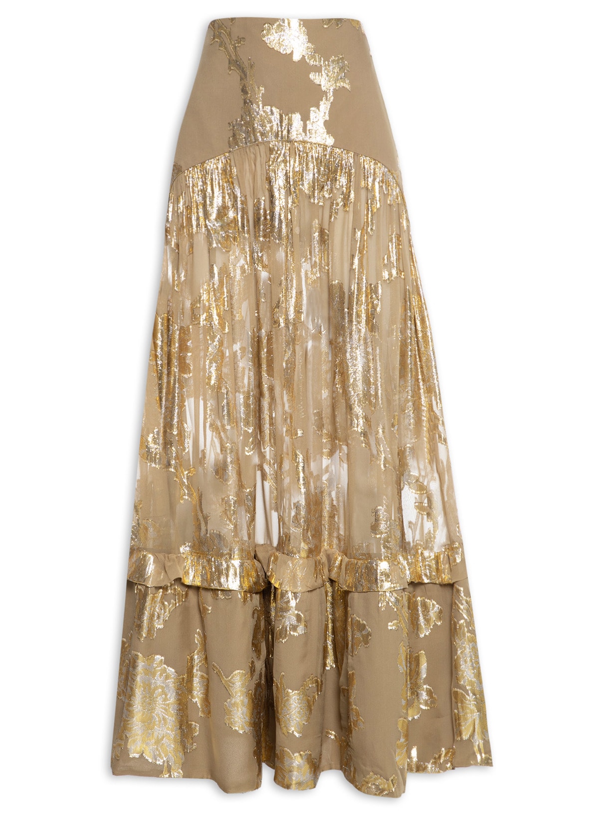 A saia bege é confeccionada em seda mista sem elasticidade. A peça solta ao corpo possui cintura alta, recorte superior assimétrico com efeito franzido, recorte com babado sobreposto, padronagem floral em fios de lurex em tons contrastantes e metalizados, transparência, forro superior e fechamento posterior em zíper invisível.