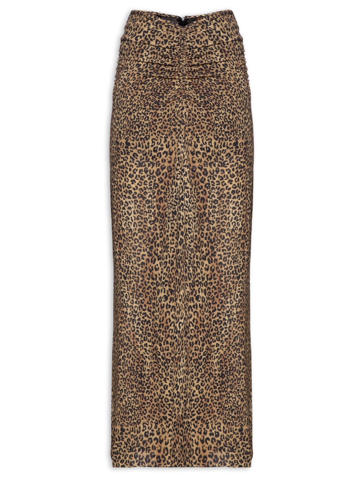 A saia animal print é confeccionada em tecido leve sem elasticidade. A peça solta ao corpo possui cintura alta, efeito franzido na parte frontal, posterior e laterais, fenda frontal, comprimento longo, forro, e fechamento posterior por zíper invisível.
