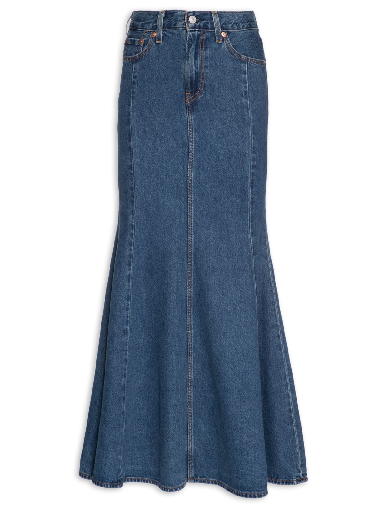 A saia longa jeans está prestes a se tornar item indispensável no seu armário, já que o jeans é sempre curinga e é um importante aliado de qualquer estação, a saia longa traz um toque feminino e moderno. Aposte no modelo da Levi's com o colete alongado, sandália flat, cinto e brincos metalizados.